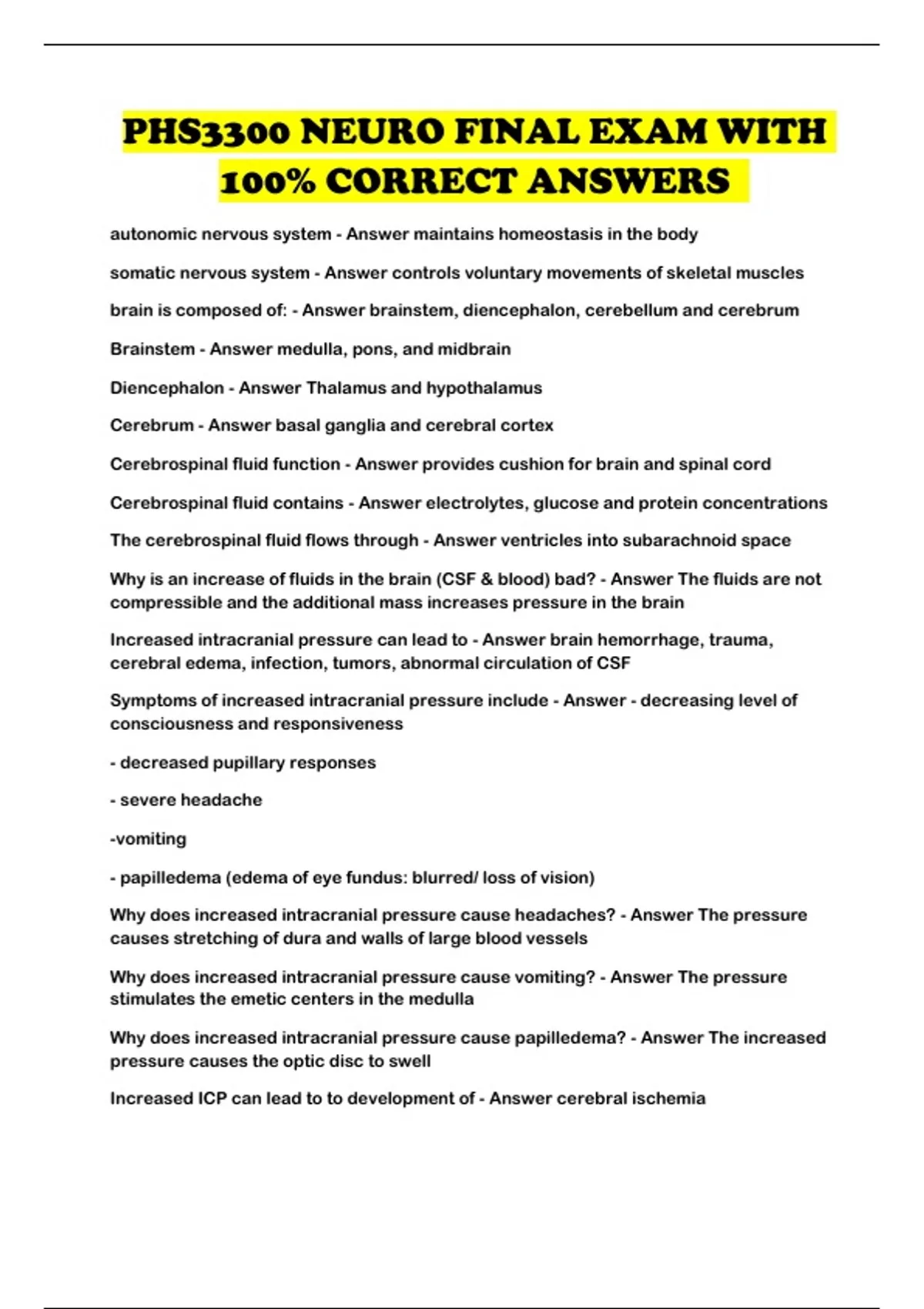 Pressure of CSF is elevated when - Answer ICP is increased