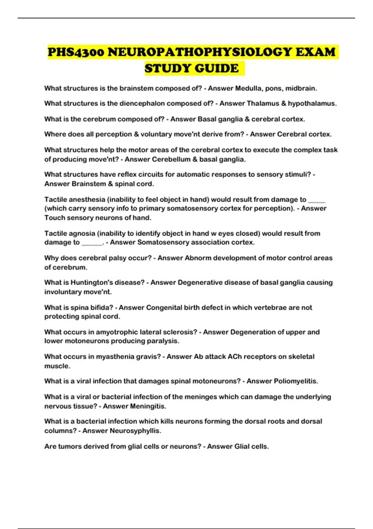 PHS4300 NEUROPATHOPHYSIOLOGY EXAM STUDY GUIDE ...