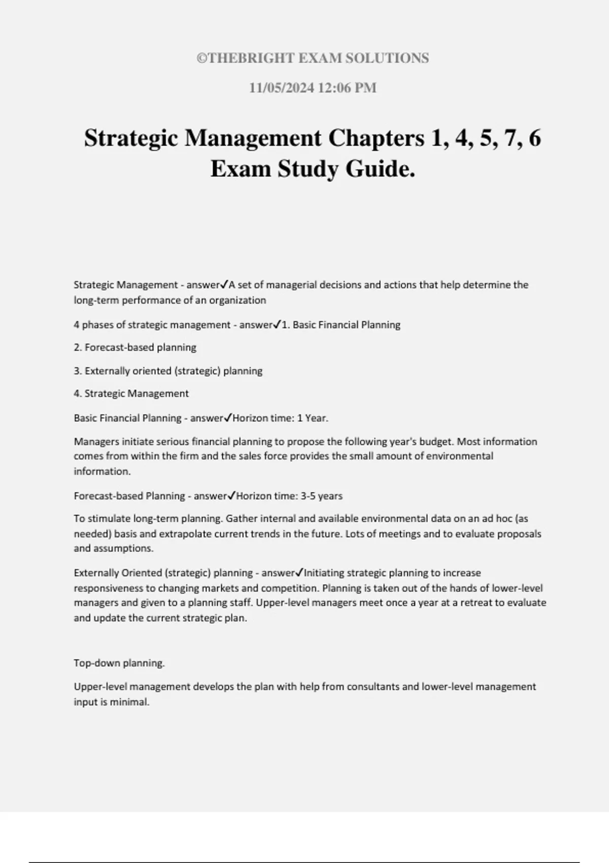 Strategic Management Chapters 1, 4, 5, 7, 6 Exam Study Guide. Strategic Management - answerA set of managerial decisions and actions that help determine the long-term performance of an organization 4 phases of strategic management - answer1. Basic Financial Planning 2. Forecast-based planning 3. Externally oriented (strategic) planning 4. Strategic Management Basic Financial Planning - answerHorizon time: 1 Year. Managers initiate serious financial planning to propose the following year's budget. Most information comes from within the firm and the sales force provides the small amount of environmental information. Forecast-based Planning - answerHorizon time: 3-5 years To stimulate long-term planning. Gather internal and available environmental data on an ad hoc (as needed) basis and extrapolate current trends in the future. Lots of meetings and to evaluate proposals and assumptions. Externally Oriented (strategic) planning - answerInitiating strategic planning to increase responsiveness to changing markets and competition. Planning is taken out of the hands of lower-level managers and given to a planning staff. Upper-level managers meet once a year at a retreat to evaluate and update the current strategic plan. Top-down planning. Upper-level management develops the plan with help from consultants and lower-level management input is minimal. ©THEBRIGHT EXAM SOLUTIONS 11/05/2024 12:06 PM Strategic Management (phase 4) - answerAll levels of management are involved. Planning is interactive across all levels. No more top-down. This phase details the implementation, evaluation and control issues. These plans emphasize probable scenarios and contingency strategies. Strategic thinking at all levels Strategic Management emphasizes ______________ performance. - answerLong-term. Many companies can sustain short bursts, but only a few can sustain it over a long period of time. 3 Most highly rated benefits of strategic management - answer1. Clearer sense of strategic vision for the firm 2. A sharper focus on what's strategically important 3. An improved understanding of a rapidly changing environment Triple Bottom Line - answerUsed to describe a business's sustainability. 1. Traditional Profit/Loss 2. People Account-social responsibility 3. Planet Account-environmental responsibility Basic Model of Strategic Management - answer1. Environmental Scanning 2. Strategy Formulation 3. Strategy Implementation 4. Evaluation and Control Environmental scanning - answermonitoring, evaluating and disseminating of information from the external and internal environments to key people within the corporation. To identify strategic factors (external and internal) that will assist in the deciding of strategic decisions. Easiest way to do this is SWOT analysis. Strategy formulation - answerinvestigation, analysis, decision making to make up the criteria for attaining a competitive advantage. 1. define the strategy 2. craft the corporation mission 3. specify achievable objectives 4. set policy guidelines
