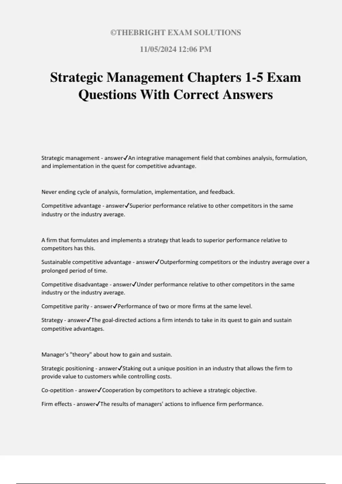 Strategic management - answer✔An integrative management field that combines analysis, formulation,