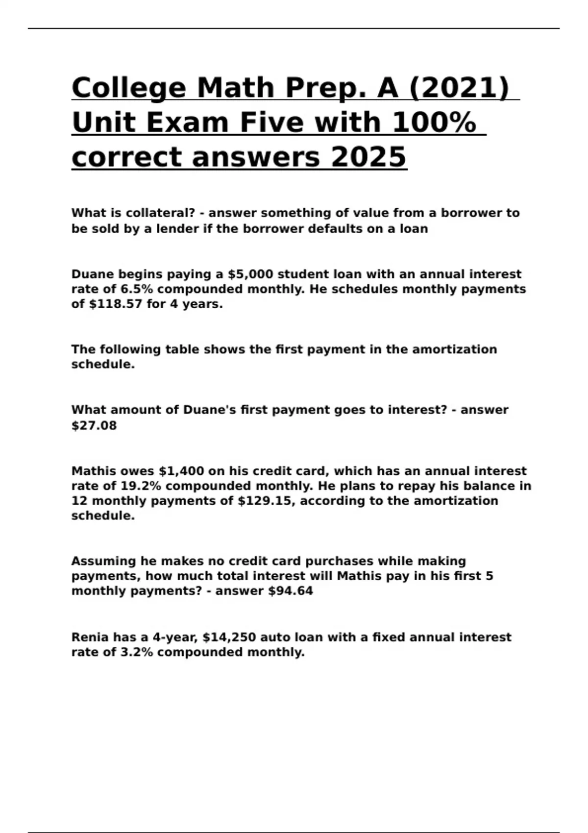 Renia has a 4-year, $14,250 auto loan with a fixed annual interest