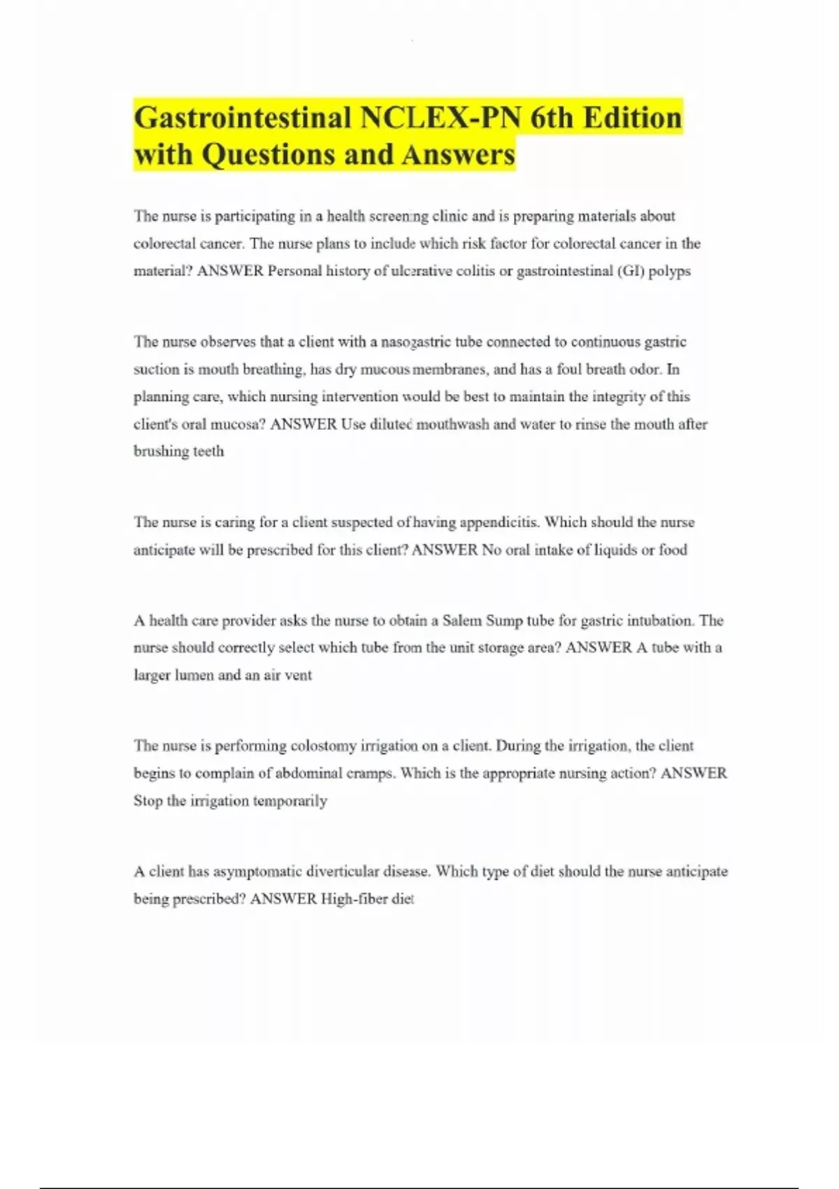 Gastrointestinal NCLEX-PN 6th Edition with Questions and Answers The nurse is participating in a health screening clinic and is preparing materials about colorectal cancer. The nurse plans to include which risk factor for colorectal cancer in the material? ANSWER Personal history of ulcerative colitis or gastrointestinal (GI) polyps The nurse observes that a client with a nasogastric tube connected to continuous gastric suction is mouth breathing, has dry mucous membranes, and has a foul breath odor. In planning care, which nursing intervention would be best to maintain the integrity of this client's oral mucosa? ANSWER Use diluted mouthwash and water to rinse the mouth after brushing teeth The nurse is caring for a client suspected of having appendicitis. Which should the nurse anticipate will be prescribed for this client? ANSWER No oral intake of liquids or food A health care provider asks the nurse to obtain a Salem Sump tube for gastric intubation. The nurse should correctly select which tube from the unit storage area? ANSWER A tube with a larger lumen and an air vent The nurse is performing colostomy irrigation on a client. During the irrigation, the client begins to complain of abdominal cramps. Which is the appropriate nursing action? ANSWER Stop the irrigation temporarily A client has asymptomatic diverticular disease. Which type of diet should the nurse anticipate being prescribed? ANSWER High-fiber diet