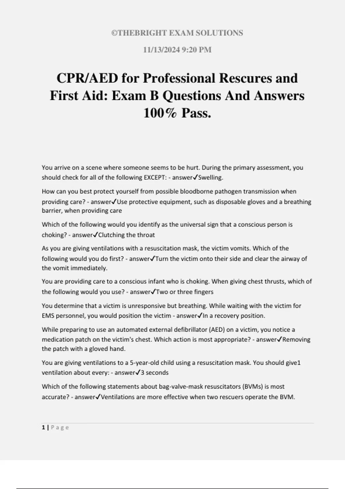 CPR/AED for Professional Rescures and First Aid: Exam B Questions And Answers 100% Pass. You arrive on a scene where someone seems to be hurt. During the primary assessment, you should check for all of the following EXCEPT: - answerSwelling. How can you best protect yourself from possible bloodborne pathogen transmission when providing care? - answerUse protective equipment, such as disposable gloves and a breathing barrier, when providing care Which of the following would you identify as the universal sign that a conscious person is choking? - answerClutching the throat As you are giving ventilations with a resuscitation mask, the victim vomits. Which of the following would you do first? - answerTurn the victim onto their side and clear the airway of the vomit immediately. You are providing care to a conscious infant who is choking. When giving chest thrusts, which of the following would you use? - answerTwo or three fingers You determine that a victim is unresponsive but breathing. While waiting with the victim for EMS personnel, you would position the victim - answerIn a recovery position. While preparing to use an automated external defibrillator (AED) on a victim, you notice a medication patch on the victim's chest. Which action is most appropriate? - answerRemoving the patch with a gloved hand. You are giving ventilations to a 5-year-old child using a resuscitation mask. You should give1 ventilation about every: - answer3 seconds Which of the following statements about bag-valve-mask resuscitators (BVMs) is most accurate? - answerVentilations are more effective when two rescuers operate the BVM.