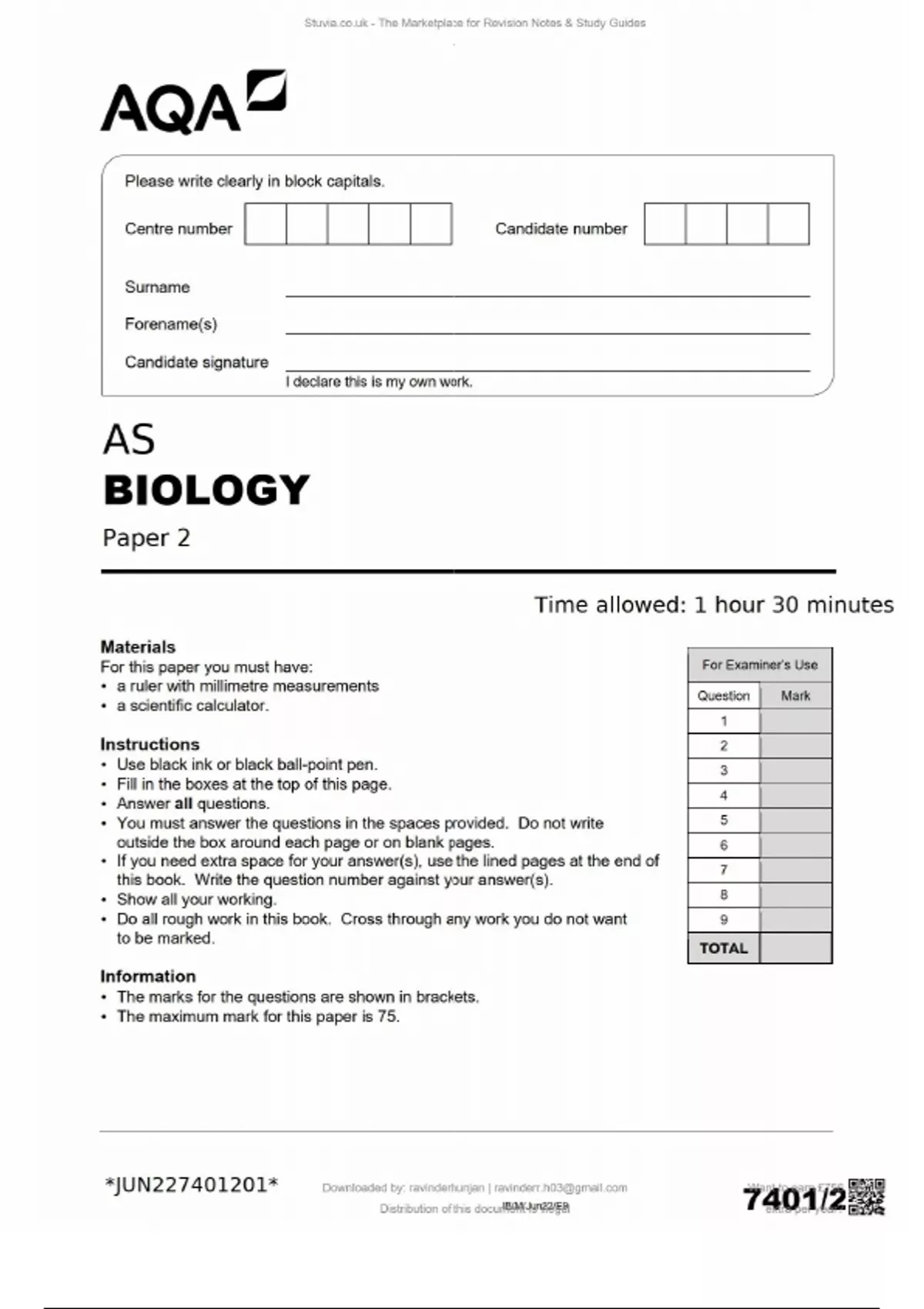 aqa_as_level_biology_paper_2. AS BIOLOGY Paper 2 Time allowed: 1 hour 30 minutes Materials For Examiner’s Use Question Mark 1 2 3 4 5 6 7 8 9 TOTAL For this paper you must have: • a ruler with millimetre measurements • a scientific calculator. Instructions • Use black ink or black ball-point pen. • Fill in the boxes at the top of this page. • Answer all questions. • You must answer the questions in the spaces provided. Do not write outside the box around each page or on blank pages. • If you need extra space for your answer(s), use the lined pages at the end of this book. Write the question number against your answer(s). • Show all your working. • Do all rough work in this book. Cross through any work you do not want to be marked. Information • The marks for the questions are shown in brackets. • The maximum mark for this paper is 75.