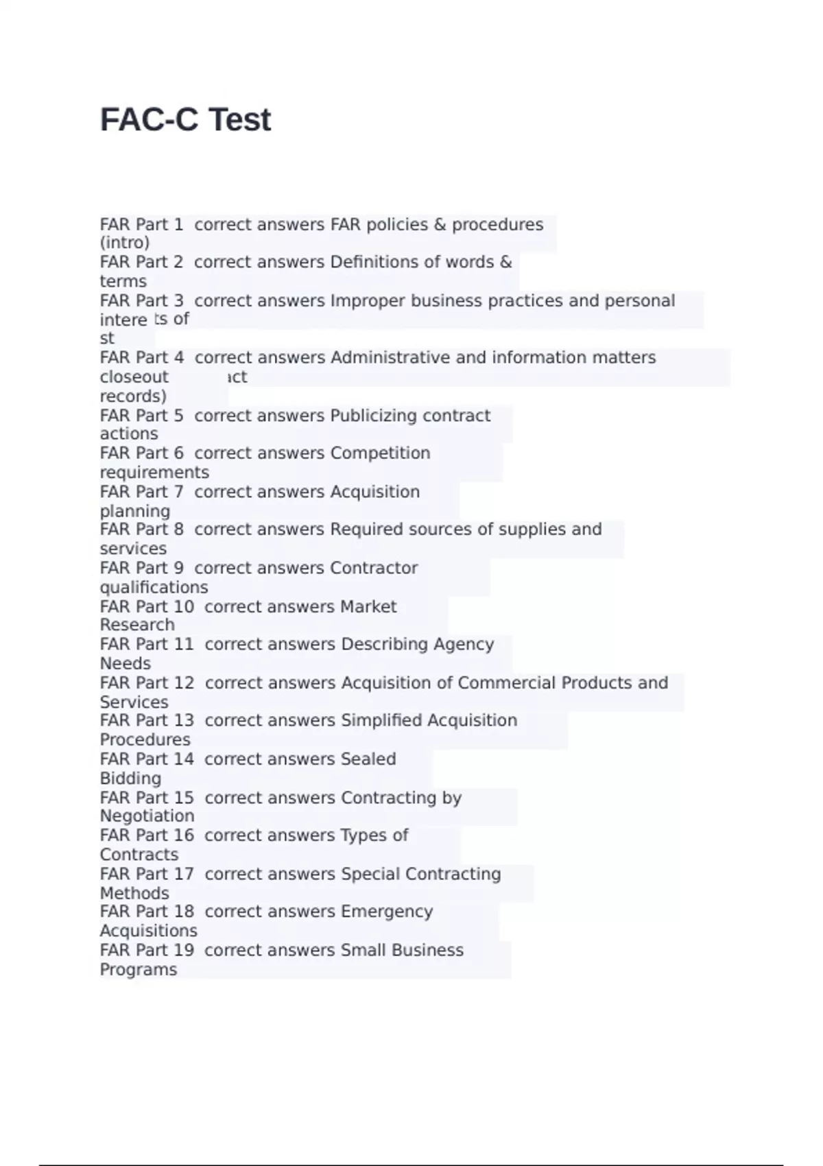 FAR Part 1 correct answers FAR policies & procedures (intro) FAR Part 2 correct answers Definitions of words & terms FAR Part 3 correct answers Improper business practices and personal conflicts of interest FAR Part 4 correct answers Administrative and information matters (includes contract closeout records) FAR Part 5 correct answers Publicizing contract actions FAR Part 6 correct answers Competition requirements FAR Part 7 correct answers Acquisition planning FAR Part 8 correct answers Required sources of supplies and services FAR Part 9 correct answers Contractor qualifications FAR Part 10 correct answers Market Research FAR Part 11 correct answers Describing Agency Needs FAR Part 12 correct answers Acquisition of Commercial Products and Services FAR Part 13 correct answers Simplified Acquisition Procedures FAR Part 14 correct answers Sealed Bidding FAR Part 15 correct answers Contracting by Negotiation FAR Part 16 correct answers Types of Contracts FAR Part 17 correct answers Special Contracting Methods FAR Part 18 correct answers Emergency Acquisitions FAR Part 19 correct answers Small Business Programs