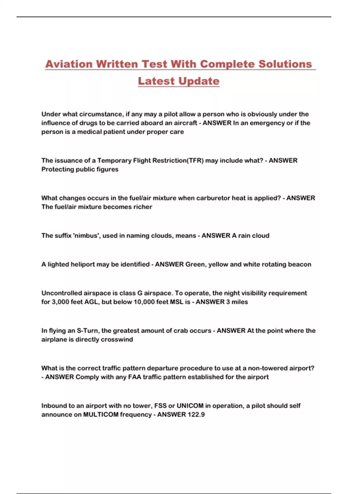 Aviation Written Test With Complete Solutions