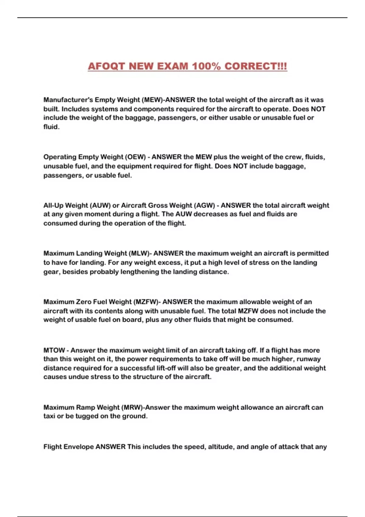 Maximum Zero Fuel Weight (MZFW)- ANSWER the maximum allowable weight of an
