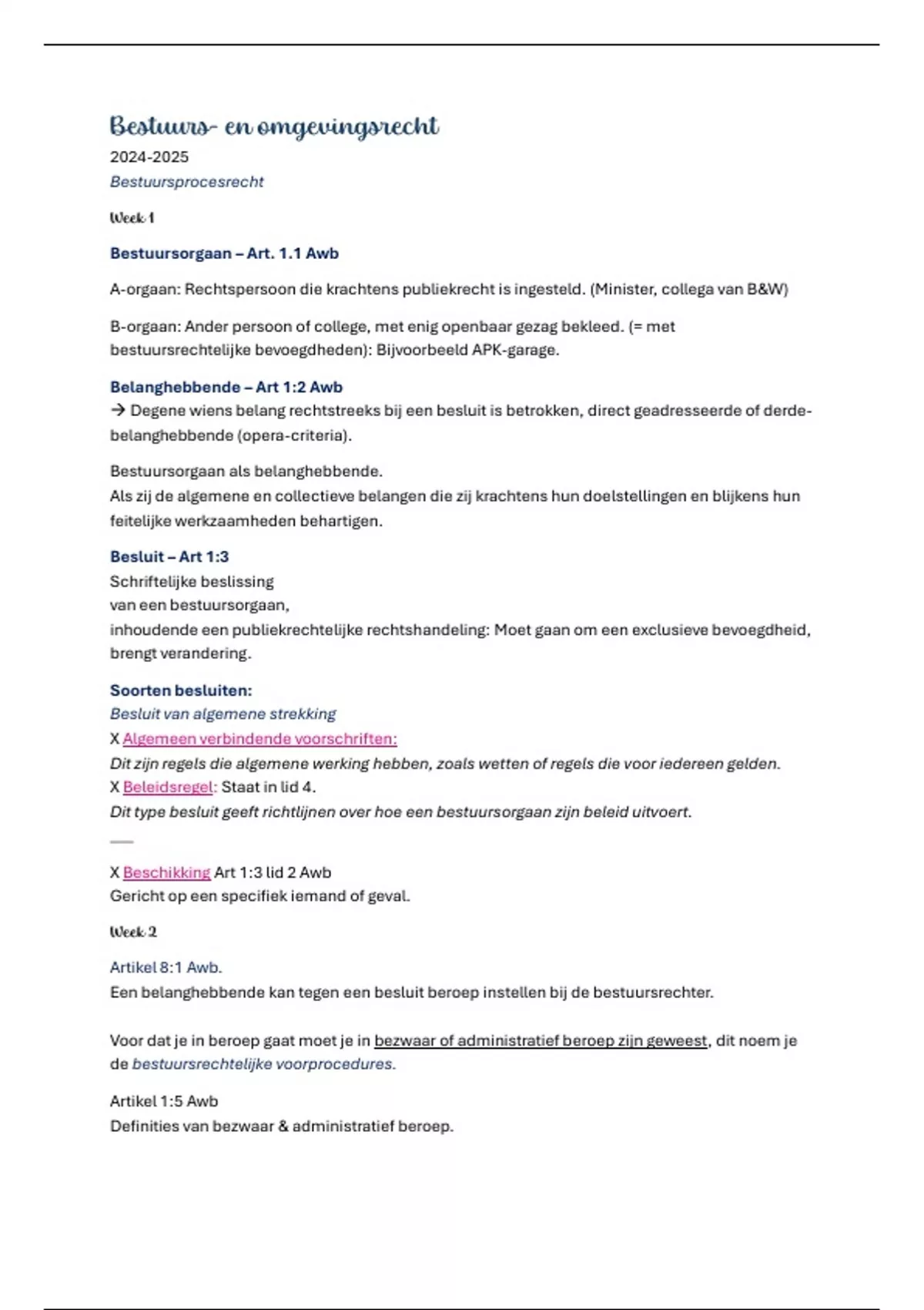 Samenvatting van: Bestuursprocesrecht & en een beknopte uitwerking van omgevingsrecht. Alles wat in de lessen wordt besproken en in de toets is gekomen is hierin uitgewerkt!