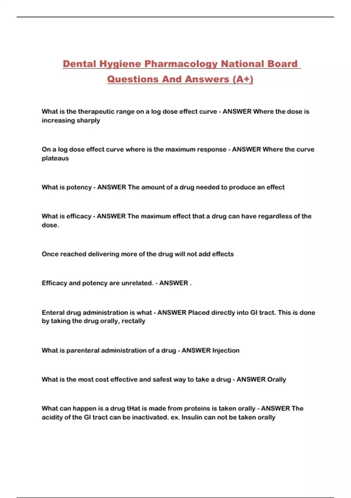 Dental Hygiene Pharmacology National Board Questions And Answers (A+)