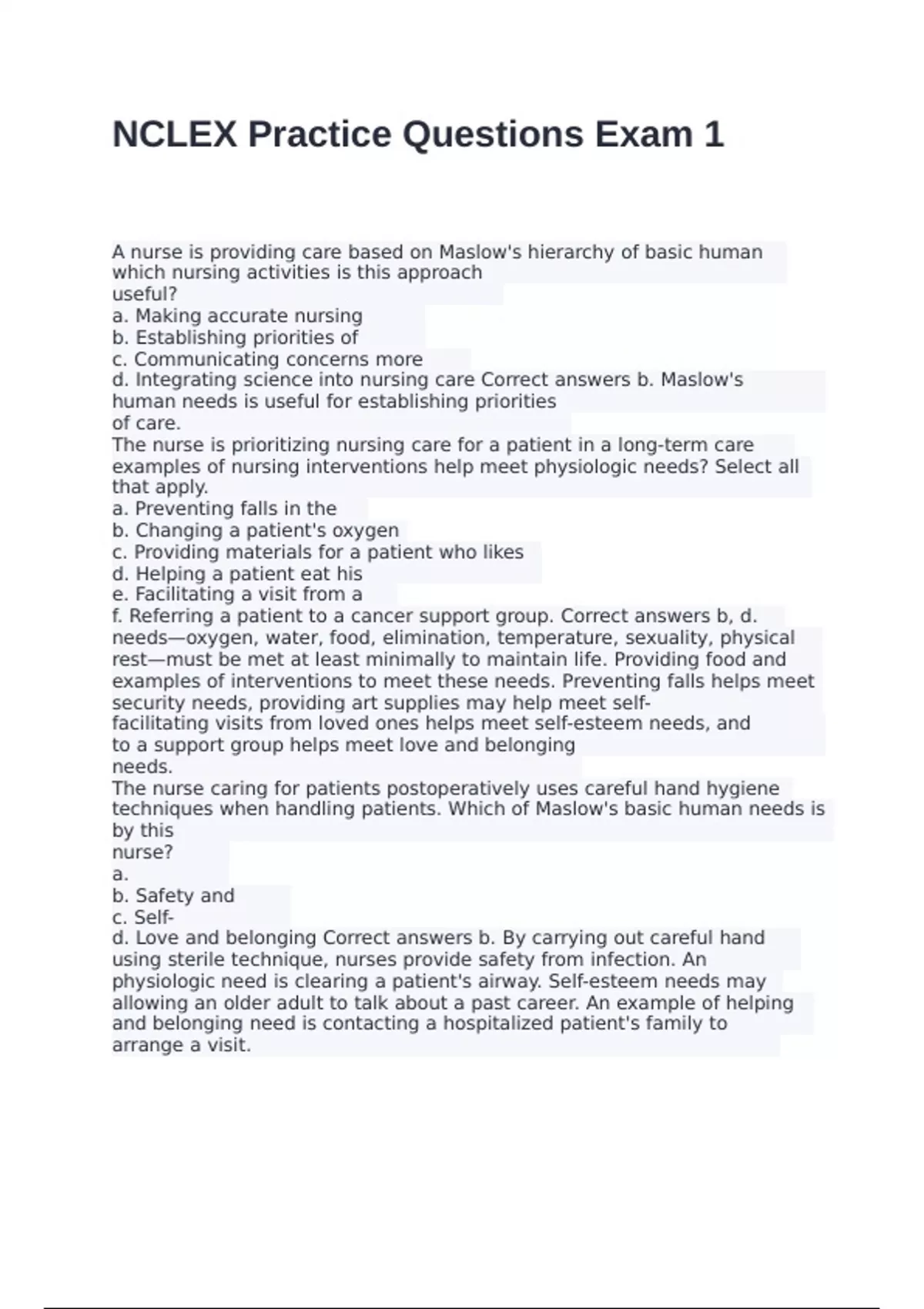 A nurse is providing care based on Maslow's hierarchy of basic human needs. For which nursing activities is this approach useful? a. Making accurate nursing diagnoses b. Establishing priorities of care c. Communicating concerns more concisely d. Integrating science into nursing care Correct answers b. Maslow's hierarchy of basic human needs is useful for establishing priorities of care. The nurse is prioritizing nursing care for a patient in a long-term care facility. Which examples of nursing interventions help meet physiologic needs? Select all that apply. a. Preventing falls in the facility b. Changing a patient's oxygen tank c. Providing materials for a patient who likes to draw d. Helping a patient eat his dinner e. Facilitating a visit from a spouse f. Referring a patient to a cancer support group. Correct answers b, d. Physiologic needs—oxygen, water, food, elimination, temperature, sexuality, physical activity, and rest—must be met at least minimally to maintain life. Providing food and oxygen are examples of interventions to meet these needs. Preventing falls helps meet safety and security needs, providing art supplies may help meet self-actualization needs, facilitating visits from loved ones helps meet self-esteem needs, and referring a patient to a support group helps meet love and belonging needs. The nurse caring for patients postoperatively uses careful hand hygiene and sterile techniques when handling patients. Which of Maslow's basic human needs is being met by this nurse? a. Physiologic b. Safety and security c. Self-esteem d. Love and belonging Correct answers b. By carrying out careful hand hygiene and using sterile technique, nurses provide safety from infection. An example of a physiologic need is clearing a patient's airway. Self-esteem needs may be met by allowing an older adult to talk about a past career. An example of helping meet a love and belonging need is contacting a hospitalized patient's family to arrange a visit.