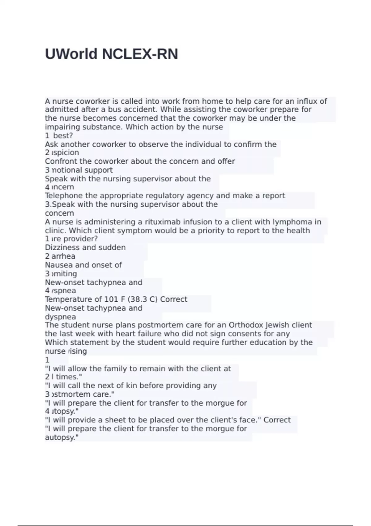A nurse coworker is called into work from home to help care for an influx of clients being admitted after a bus accident. While assisting the coworker prepare for incoming clients, the nurse becomes concerned that the coworker may be under the influence of an impairing substance. Which action by the nurse is best? 1. Ask another coworker to observe the individual to confirm the suspicion 2. Confront the coworker about the concern and offer emotional support 3. Speak with the nursing supervisor about the concern 4. Telephone the appropriate regulatory agency and make a report Correct answers 3.Speak with the nursing supervisor about the concern A nurse is administering a rituximab infusion to a client with lymphoma in an oncology clinic. Which client symptom would be a priority to report to the health care provider? 1. Dizziness and sudden diarrhea 2. Nausea and onset of vomiting 3. New-onset tachypnea and dyspnea 4. Temperature of 101 F (38.3 C) Correct answers 3. New-onset tachypnea and dyspnea The student nurse plans postmortem care for an Orthodox Jewish client hospitalized for the last week with heart failure who did not sign consents for any postmortem actions. Which statement by the student would require further education by the supervising nurse? 1. "I will allow the family to remain with the client at all times." 2. "I will call the next of kin before providing any postmortem care." 3. "I will prepare the client for transfer to the morgue for autopsy." 4. "I will provide a sheet to be placed over the client's face." Correct answers 3. "I will prepare the client for transfer to the morgue for autopsy."