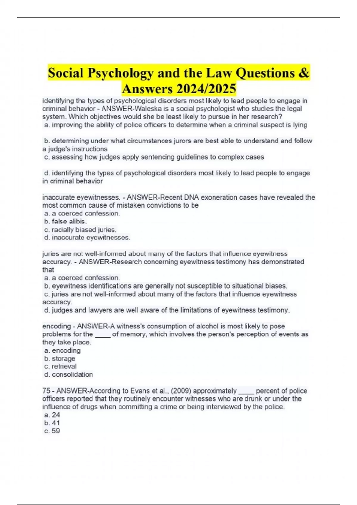 Social Psychology and the Law Questions & Answers 2024/2025 identifying the types of psychological disorders most likely to lead people to engage in criminal behavior - ANSWER-Waleska is a social psychologist who studies the legal system. Which objectives would she be least likely to pursue in her research? a. improving the ability of police officers to determine when a criminal suspect is lying b. determining under what circumstances jurors are best able to understand and follow a judge's instructions c. assessing how judges apply sentencing guidelines to complex cases d. identifying the types of psychological disorders most likely to lead people to engage in criminal behavior inaccurate eyewitnesses. - ANSWER-Recent DNA exoneration cases have revealed the most common cause of mistaken convictions to be a. a coerced confession. b. false alibis. c. racially biased juries. d. inaccurate eyewitnesses. juries are not well-informed about many of the factors that influence eyewitness accuracy. - ANSWER-Research concerning eyewitness testimony has demonstrated that a. a coerced confession. b. eyewitness identifications are generally not susceptible to situational biases. c. juries are not well-informed about many of the factors that influence eyewitness accuracy. d. judges and lawyers are well aware of the limitations of eyewitness testimony. encoding - ANSWER-A witness's consumption of alcohol is most likely to pose problems for the ____ of memory, which involves the person's perception of events as they take place. a. encoding b. storage c. retrieval d. consolidation 75 - ANSWER-According to Evans et al., (2009) approximately ____ percent of police officers reported that they routinely encounter witnesses who are drunk or under the influence of drugs when committing a crime or being interviewed by the police. a. 24 b. 41 c. 59 d. 75 higher anxiety levels were associated with less accurate eyewitness identification. - ANSWER-When Valentine and Mesout (2009) fitted visitors to the London Dungeon with a wireless heart monitor, they found that a. higher anxiety levels were associated with more accurate eyewitness identification. b. higher anxiety levels were associated with less accurate eyewitness identification. c. heart rate corresponded to arousal level. d. heart rate corresponded to the number of perpetrators encountered. weapon - ANSWER-Emily has just witnessed a violent crime. She is very worked up about it. In this agitated state, Emily is most likely to focus on the a. weapon. b. culprit. c. setting. d. victim. weapon-focus effect. - ANSWER-The tendency for the presence of a weapon to draw attention and impair a witness's ability to identify a culprit is called the a. weapon-focus effect. b. distraction effect. c. inattention phenomenon. d. CSI effect. weapon-focus effect - ANSWER-After Natalie testifies in court that she witnessed the defendant committing an armed robbery, a memory expert is called to testify on behalf of the defense. The expert testifies that Natalie's ability to encode the information accurately was probably impaired. Which factor did the expert most likely have in mind when he questioned Natalie's ability to acquire the information accurately? a. weapon-focus effect b. reconstructive memory c. misleading questions d. leniency bias spend more time looking at the knife. - ANSWER-Prida has witnessed a violent crime involving a knife. Research suggests that he will be less likely to identify the culprit than in a situation where no knife was present because Prida will a. be less aroused. b. focus more on the victim. c. spend more time looking at the knife. d. be too afraid to remember anything accurately. cross-race identification bias. - ANSWER-The tendency for people to be more accurate at recognizing members of their own racial group than of other groups is called the a. in group homogeneity effect. b. out group homogeneity effect. c. own-race identification bias. d. cross-race identification bias. Christopher, who is the same race as the thief - ANSWER-Tony, Silvio, Paulie, and Christopher were all in the convenience store when it was robbed. Who is likely to be the most reliable eyewitness? a. Tony, who was the only one to notice that the thief was brandishing a gun b. Silvio, who was extremely frightened by the whole incident c. Paulie, who was drunk at the time of the crime d. Christopher, who is the same race as the thief age group - ANSWER-According to the research of Rhodes & Anastasi (2012), children, young adults, and the elderly all had difficulty recognizing others who were part of a different ____ than their own. a. neighborhood b. age group c. ethnicity d. religion the reconstructive nature of memory. - ANSWER-Eyewitnesses' reports of crime details can be altered by exposure to post-event information. This results from a. the reliance on peremptory challenges. b. the reconstructive nature of memory. c. normative influence pressures. d. the positive coercion bias. the wording affected the participants' memory for the accident. - ANSWER-Loftus and Palmer (1974) manipulated the wording of questions posed to participants who witness a filmed traffic accident. Their findings suggest that a. the wording affected the participants' memory for the accident. b. the wording did not affect the participants' memory for the accident. c. witnesses often store multiple, contradictory memories for a single event. d. most eyewitness errors have to do with problems that arise during encoding. misinformation effect. - ANSWER-The tendency for false post-event information to become integrated into a person's memory for the event is called the a. misinformation effect. b. familiarity-induced bias. c. leniency bias. d. positive coercion bias. false memories tended to occur in the auditory cortex. - ANSWER-Stark and others (2010) showed participants slides of a man stealing a woman's wallet and slipping it in his jacket. Then an auditory recording recounted the event, stating th