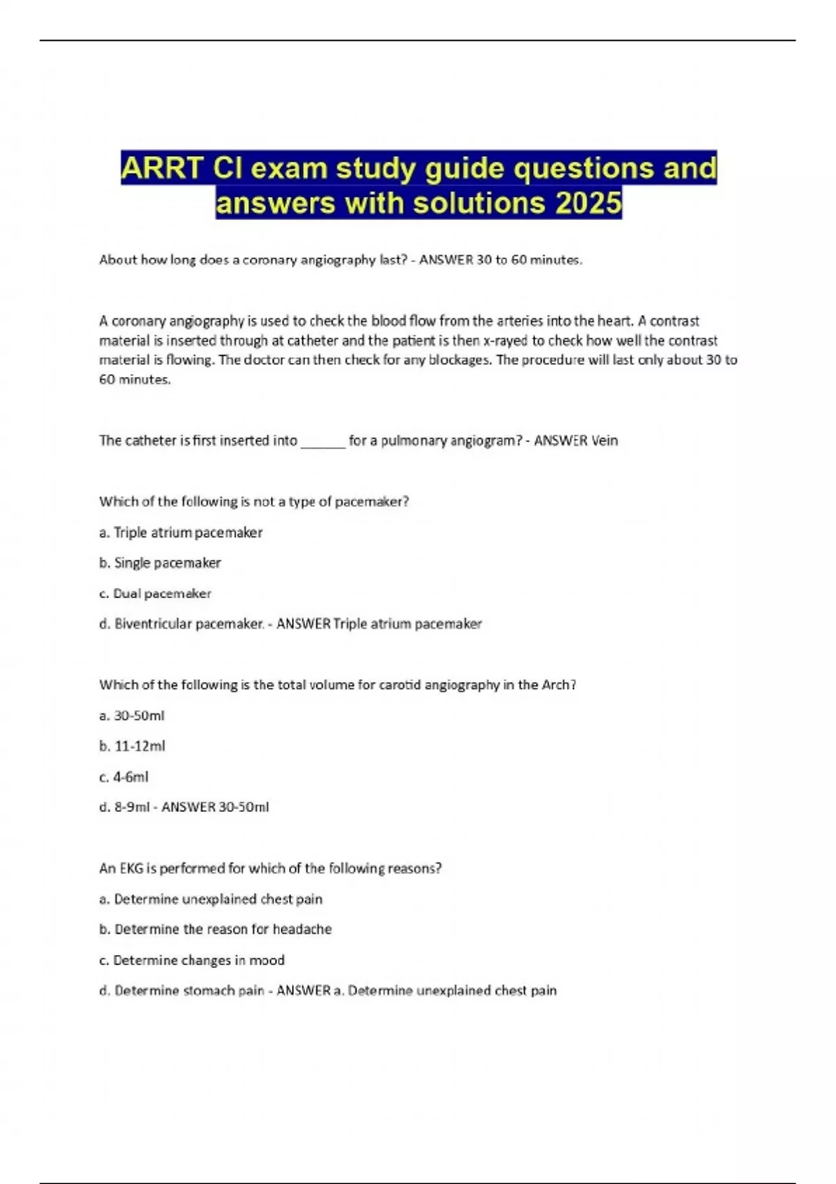 About how long does a coronary angiography last? - ANSWER 30 to 60 minutes. A coronary angiography is used to check the blood flow from the arteries into the heart. A contrast material is inserted through at catheter and the patient is then x-rayed to check how well the contrast material is flowing. The doctor can then check for any blockages. The procedure will last only about 30 to 60 minutes. The catheter is first inserted into ______ for a pulmonary angiogram? - ANSWER Vein Which of the following is not a type of pacemaker? a. Triple atrium pacemaker b. Single pacemaker c. Dual pacemaker d. Biventricular pacemaker. - ANSWER Triple atrium pacemaker Which of the following is the total volume for carotid angiography in the Arch? a. 30-50ml b. 11-12ml c. 4-6ml d. 8-9ml - ANSWER 30-50ml An EKG is performed for which of the following reasons? a. Determine unexplained chest pain b. Determine the reason for headache c. Determine changes in mood d. Determine stomach pain - ANSWER a. Determine unexplained chest pain Odansetron (Zofran) is a medication used to treat or prevent nausea and vomiting. What is the proper IV dose of this medicine for the average adult patient? - ANSWER 4mg, repeat x 1 if necessary Regarding the coagulation profile, what is the normal time range for bleeding time? - ANSWER 2-9 minutes