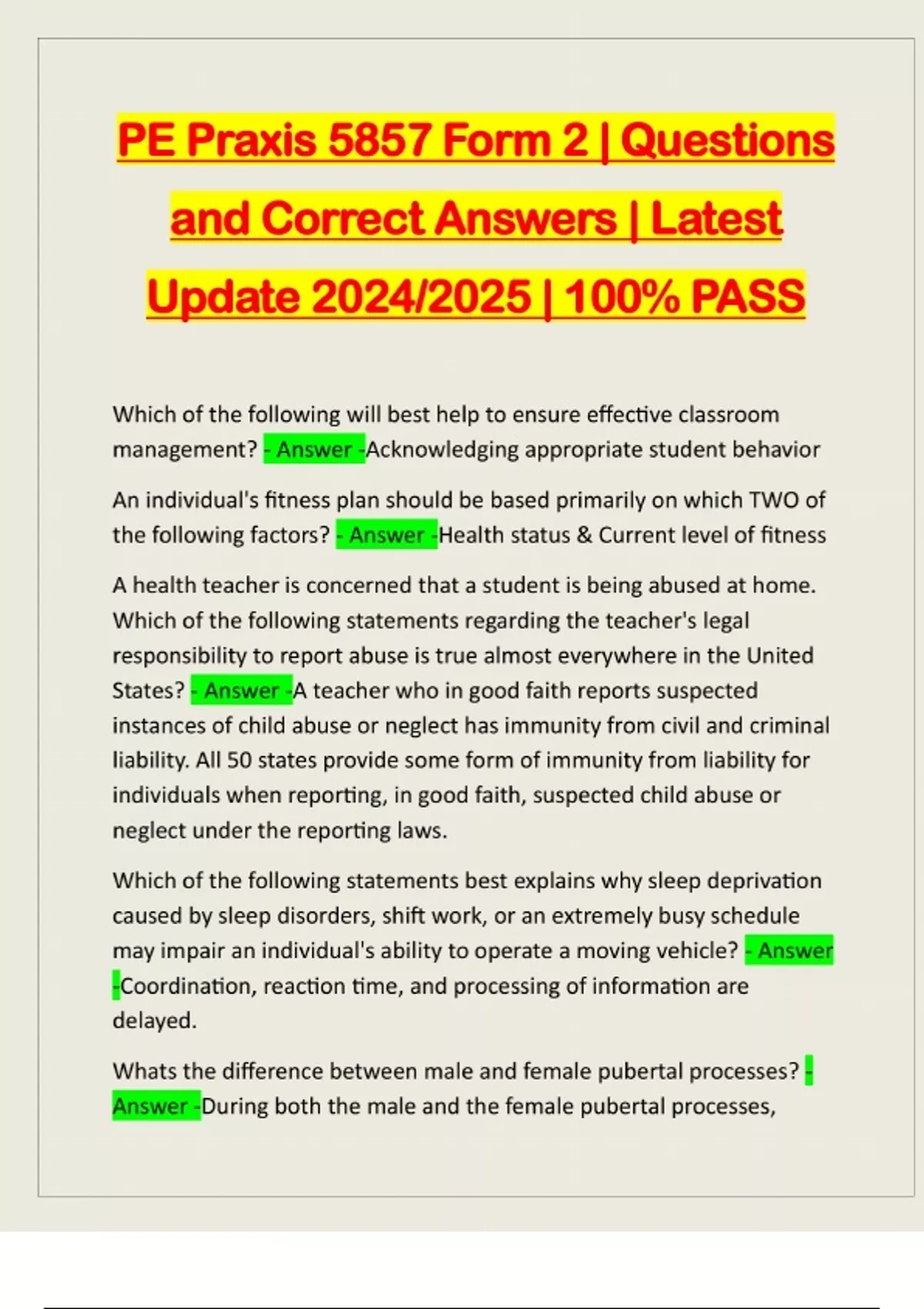 PE Praxis 5857 Form 2 | Questions and Correct Answers | Latest Update 2024/2025 | 100% PASS Which of the following will best help to ensure effective classroom management? - Answer -Acknowledging appropriate student behavior An individual's fitness plan should be based primarily on which TWO of the following factors? - Answer -Health status & Current level of fitness A health teacher is concerned that a student is being abused at home. Which of the following statements regarding the teacher's legal responsibility to report abuse is true almost everywhere in the United States? - Answer -A teacher who in good faith reports suspected instances of child abuse or neglect has immunity from civil and criminal liability. All 50 states provide some form of immunity from liability for individuals when reporting, in good faith, suspected child abuse or neglect under the reporting laws. Which of the following statements best explains why sleep deprivation caused by sleep disorders, shift work, or an extremely busy schedule may impair an individual's ability to operate a moving vehicle? - Answer -Coordination, reaction time, and processing of information are delayed. Whats the difference between male and female pubertal processes? - Answer -During both the male and the female pubertal processes,deepening of the voice, appearance of body hair, and increased height and weight occur. Secondary sex characteristics such as an increased fat distribution occur only during the female pubertal process. Which THREE of the following are common forms of domestic violence? - Answer -Sexual abuse Emotional abuse