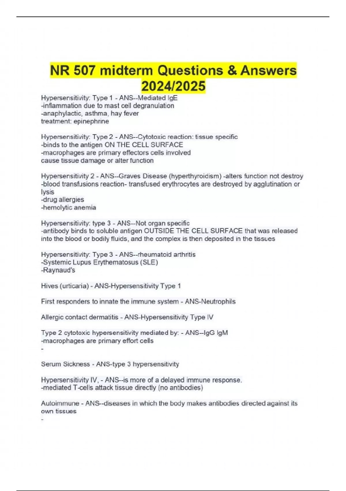 NR 507 midterm Questions & Answers 2024/2025 Hypersensitivity: Type 1 - ANS--Mediated IgE -inflammation due to mast cell degranulation -anaphylactic, asthma, hay fever treatment: epinephrine Hypersensitivity: Type 2 - ANS--Cytotoxic reaction: tissue specific -binds to the antigen ON THE CELL SURFACE -macrophages are primary effectors cells involved cause tissue damage or alter function Hypersensitivity 2 - ANS--Graves Disease (hyperthyroidism) -alters function not destroy -blood transfusions reaction- transfused erythrocytes are destroyed by agglutination or lysis -drug allergies -hemolytic anemia Hypersensitivity: type 3 - ANS--Not organ specific -antibody binds to soluble antigen OUTSIDE THE CELL SURFACE that was released into the blood or bodily fluids, and the complex is then deposited in the tissues Hypersensitivity: Type 3 - ANS--rheumatoid arthritis -Systemic Lupus Erythematosus (SLE) -Raynaud's Hives (urticaria) - ANS-Hypersensitivity Type 1 First responders to innate the immune system - ANS-Neutrophils Allergic contact dermatitis - ANS-Hypersensitivity Type IV Type 2 cytotoxic hypersensitivity mediated by: - ANS--IgG IgM -macrophages are primary effort cells - Serum Sickness - ANS-type 3 hypersensitivity Hypersensitivity IV, - ANS--is more of a delayed immune response. -mediated T-cells attack tissue directly (no antibodies) Autoimmune - ANS--diseases in which the body makes antibodies directed against its own tissues - Primary immunodeficiency - ANS--Genetic; inherited -result of single gene defects -B and T cell deficiencies secondary immunodeficiency - ANS--acquired Common cause of secondary immunodeficiency - ANS-Malnutrition Most patients diagnosed with SLE will have a positive? - ANS-antinuclear antibody (ANA) SLE (lupus) - ANS--Facial rash -vasculitis - tissue inflammation Renal disease associated with autoimmunity? - ANS-Glomerulonephritis Sjogren's syndrome - ANS-Inflammation in salivary and lacrimal glands SLE - ANS-Autoantibodies and auto-active t-cells against DNA and nucleoprotein Sjögren's syndrome immune changes: - ANS-Autoantibodies and auto-reactive t-cells against apoptotic cells rheumatoid arthritis manifestations: - ANS-Joint inflammation, stiffness, pain, loss of range of motion Rheumatoid Arthritis immune changes: - ANS-T-cells and B cells against joint associated antigens MS manifestations - ANS-Formation of sclerotic plaque in the brain, leads to Muscle weakness and ataxia MS immune changes - ANS-T-cells against brain antigens ___ measures the average size of RBCs - ANS-MCV Anemia occurs by... - ANS--impaired RBC production -excessive blood loss - increased RBC production microlytic anemia is characterized by hyper chromic RBS: - ANS-Hereditary spherocytosis Anemia - ANS--"without blood" 4.7-6.1mcl - ANS-Normal for men RBC 4.5-5.2mcL - ANS-Normal for women RBC 13.5-17.5 - ANS-Normal hemoglobin for men 12.0-15.5 g/dL - ANS-Normal hemoglobin for women RBC - ANS-The number of erythrocytes in 1 cubic mm of whole blood Hemoglobin (Hgb) - ANS-The oxygen-carrying pigment of red cells Hematocrit (Hct) - ANS-The volume of cells as a % of total volume of cells and plasma in whole blood 42-45% - ANS-Normal for HCT for men 37-48% - ANS-Normal HCT for women Mean Cell Volume (MCV) - ANS-Measures the average size of the RBC 80-100 fL - ANS-Normal MCV RDW (red cell distribution width) - ANS-Estimate of the uniformity of individual cell size 11.5- 14.5% - ANS-Normal RDW Microcytic (MVC <80fL) - ANS-Iron deficiency Microcytic (MVC <80fL) less than - ANS-Sideroblastic Microcytic (MVC <80fL) - ANS-Thalassemia Microcytic (MVC <80fL) - ANS-Anemia of chronic disease Normocytic (MVC 80-99) - ANS-Anemia of inflammation and chronic disease Normocytic (MVC 80-99) - ANS-Hereditary spherocytosis Continues...