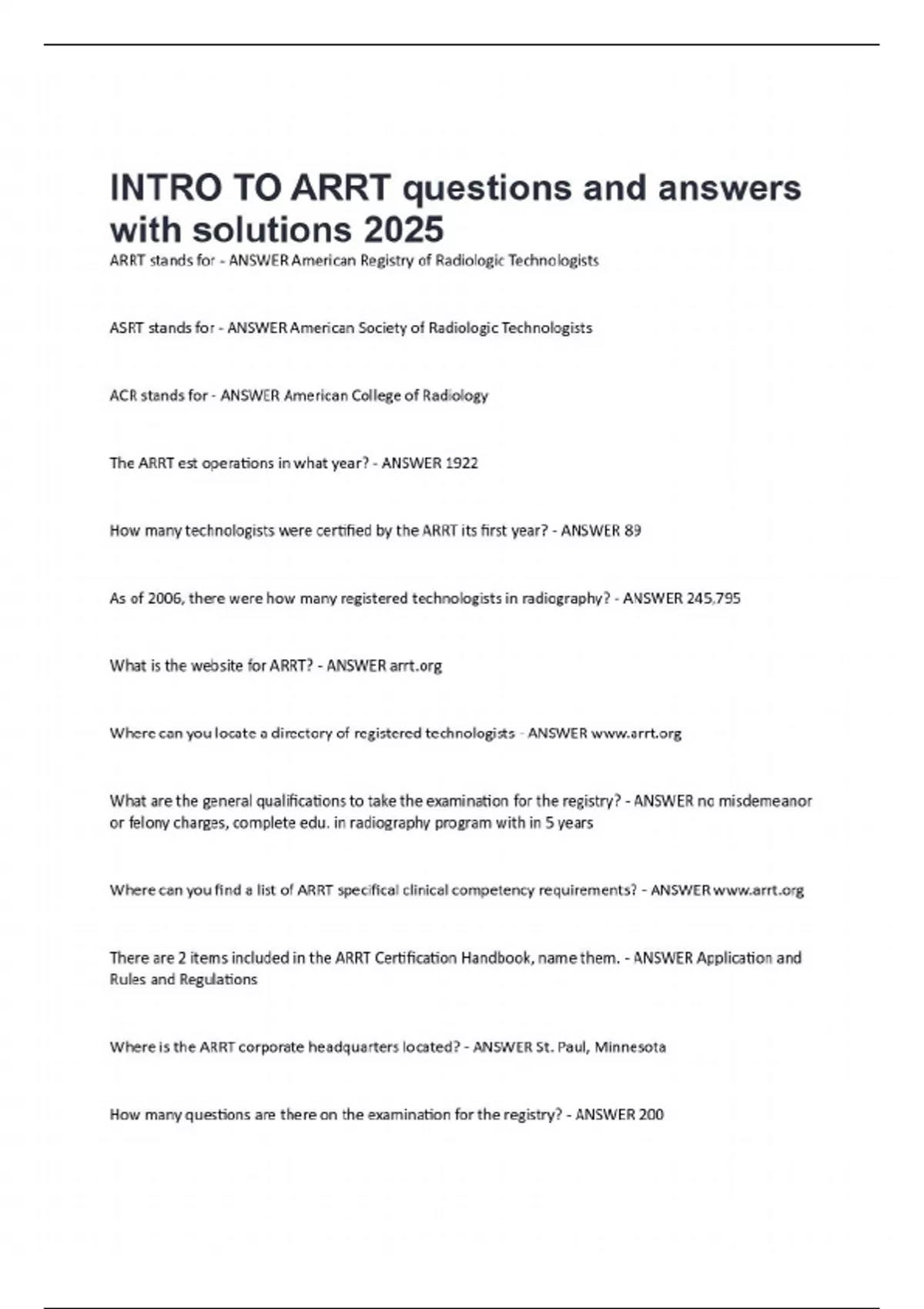 ARRT stands for - ANSWER American Registry of Radiologic Technologists ASRT stands for - ANSWER American Society of Radiologic Technologists ACR stands for - ANSWER American College of Radiology The ARRT est operations in what year? - ANSWER 1922 How many technologists were certified by the ARRT its first year? - ANSWER 89 As of 2006, there were how many registered technologists in radiography? - ANSWER 245,795 What is the website for ARRT? - ANSWER Where can you locate a directory of registered technologists - ANSWER What are the general qualifications to take the examination for the registry? - ANSWER no misdemeanor or felony charges, complete edu. in radiography program with in 5 years Where can you find a list of ARRT specifical clinical competency requirements? - ANSWER