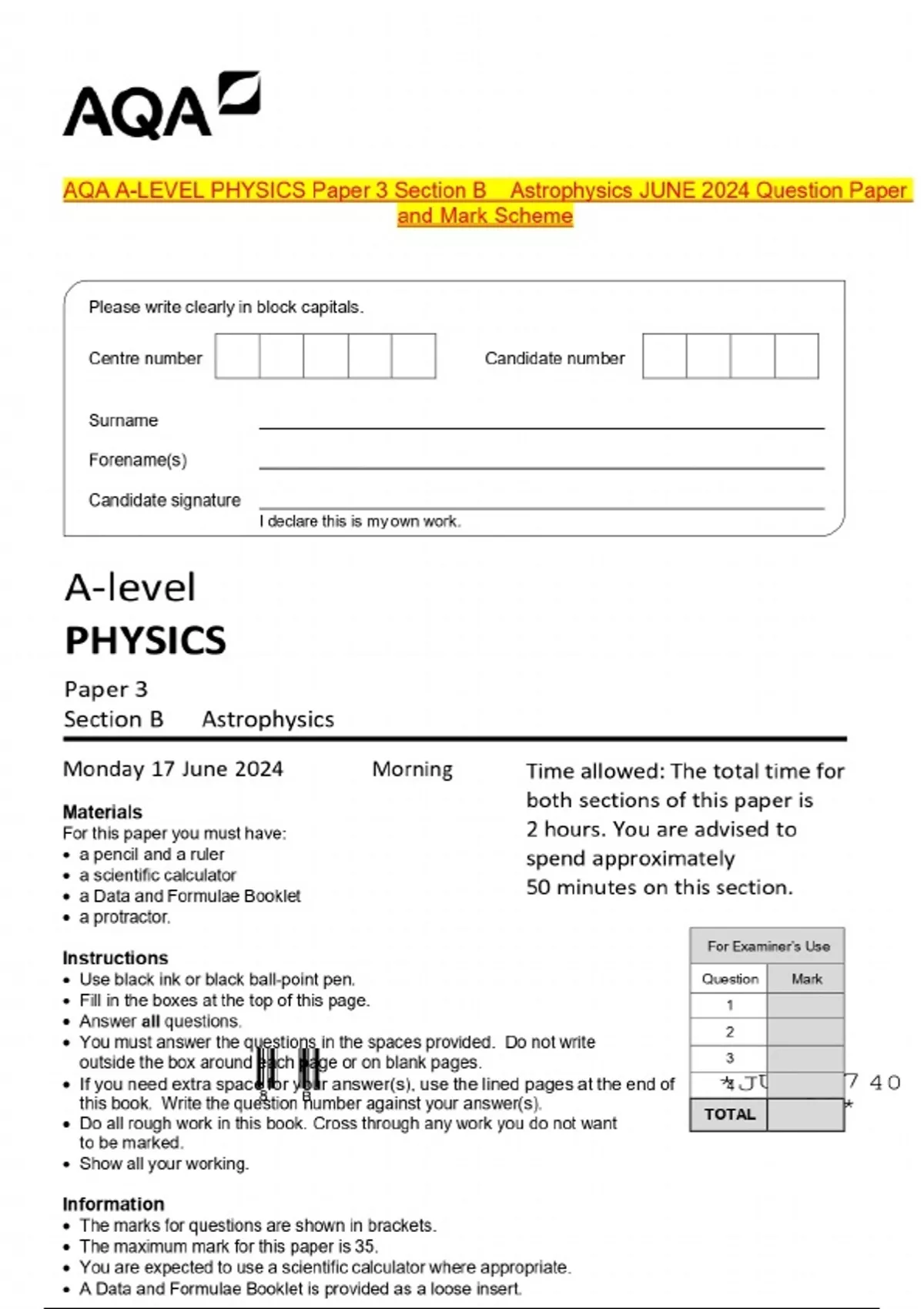QA A-LEVEL PHYSICS Paper 3 Section B Astrophysics JUNE 2024 Question Paper and Mark Scheme