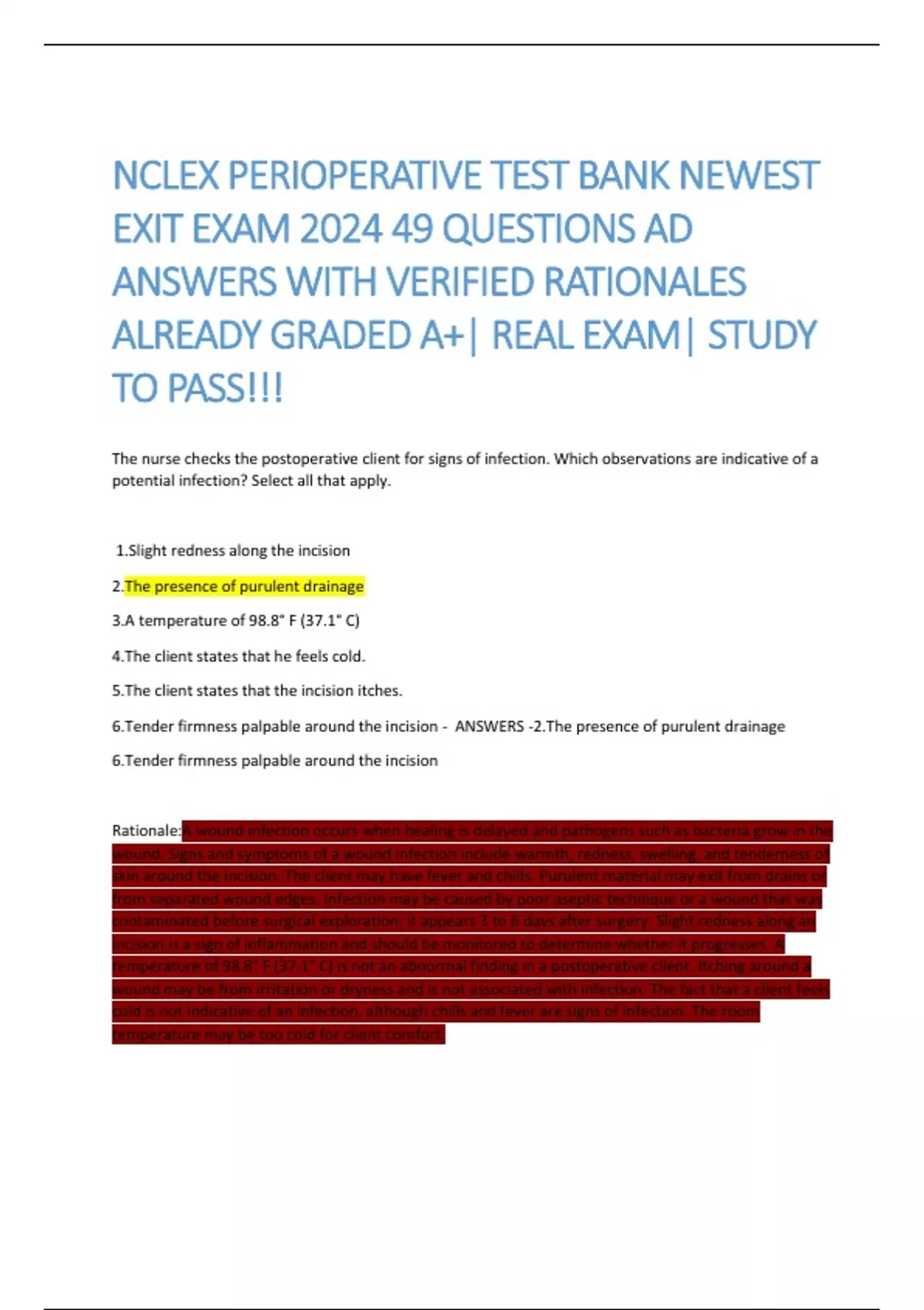 NCLEX PERIOPERATIVE TEST BANK NEWEST EXIT EXAM 2024 49 QUESTIONS AD ANSWERS WITH VERIFIED RATIONALES ALREADY GRADED A+| REAL EXAM| STUDY TO PASS!!!