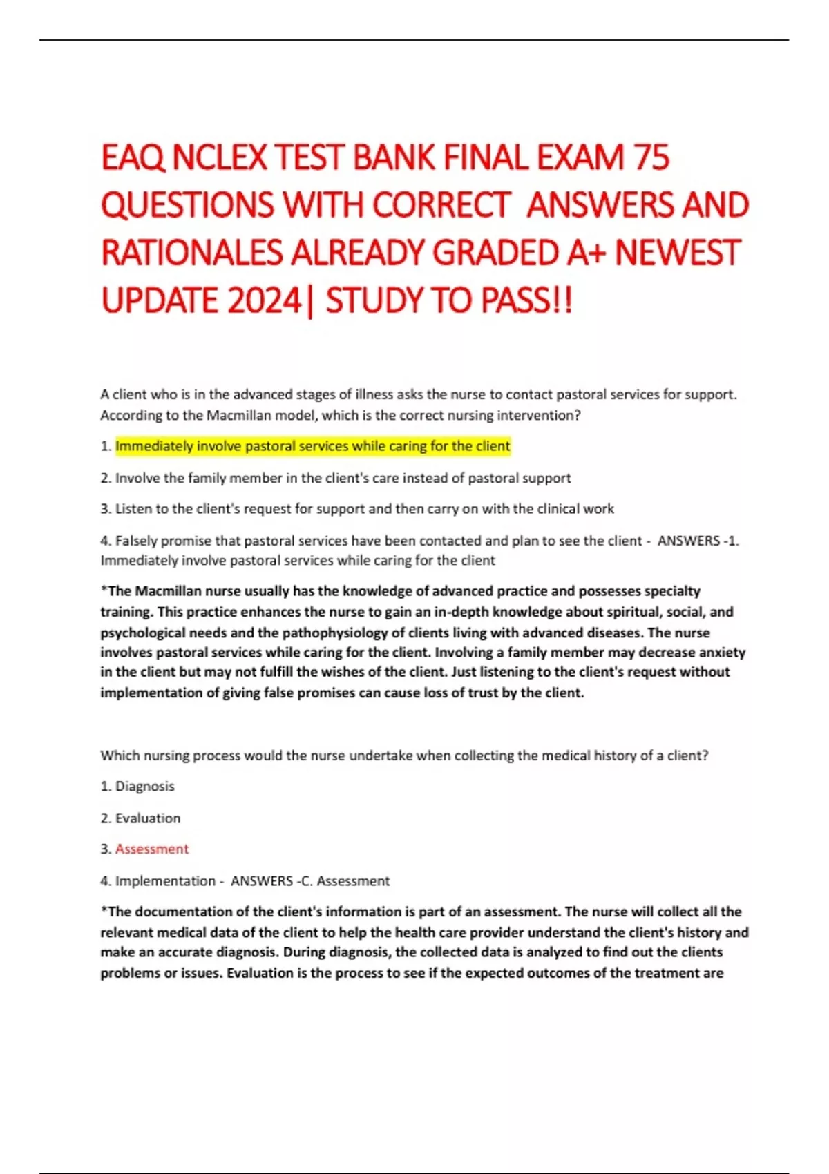 EAQ NCLEX TEST BANK FINAL EXAM 75 QUESTIONS WITH CORRECT ANSWERS AND RATIONALES ALREADY GRADED A+ NEWEST UPDATE 2024| STUDY TO PASS!! EAQ NCLEX TEST BANK FINAL EXAM 75 QUESTIONS WITH CORRECT ANSWERS AND RATIONALES ALREADY GRADED A+ NEWEST UPDATE 2024| STUDY TO PASS!! EAQ NCLEX TEST BANK FINAL EXAM 75 QUESTIONS WITH CORRECT ANSWERS AND RATIONALES ALREADY GRADED A+ NEWEST UPDATE 2024| STUDY TO PASS!! EAQ NCLEX TEST BANK FINAL EXAM 75 QUESTIONS WITH CORRECT ANSWERS AND RATIONALES ALREADY GRADED A+ NEWEST UPDATE 2024| STUDY TO PASS!! EAQ NCLEX TEST BANK FINAL EXAM 75 QUESTIONS WITH CORRECT ANSWERS AND RATIONALES ALREADY GRADED A+ NEWEST UPDATE 2024| STUDY TO PASS!! EAQ NCLEX TEST BANK FINAL EXAM 75 QUESTIONS WITH CORRECT ANSWERS AND RATIONALES ALREADY GRADED A+ NEWEST UPDATE 2024| STUDY TO PASS!! EAQ NCLEX TEST BANK FINAL EXAM 75 QUESTIONS WITH CORRECT ANSWERS AND RATIONALES ALREADY GRADED A+ NEWEST UPDATE 2024| STUDY TO PASS!!