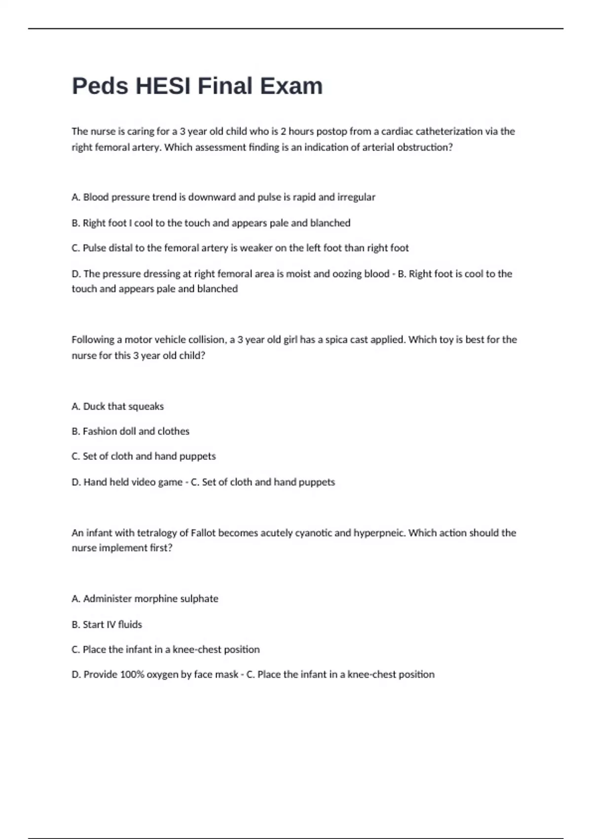 The nurse is caring for a 3 year old child who is 2 hours postop from a cardiac catheterization via the