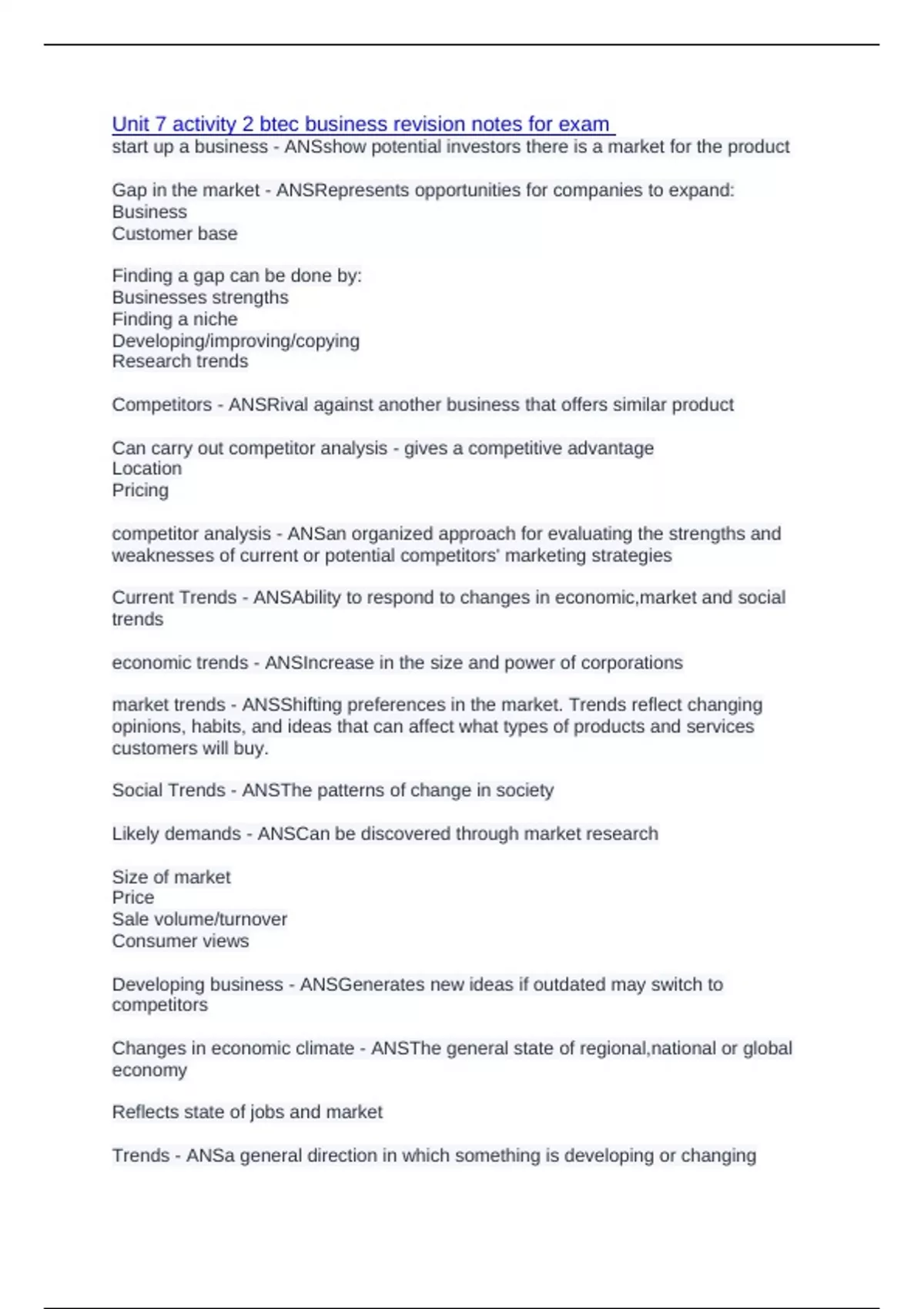 Unit 7 activity 2 btec business revision notes for exam
