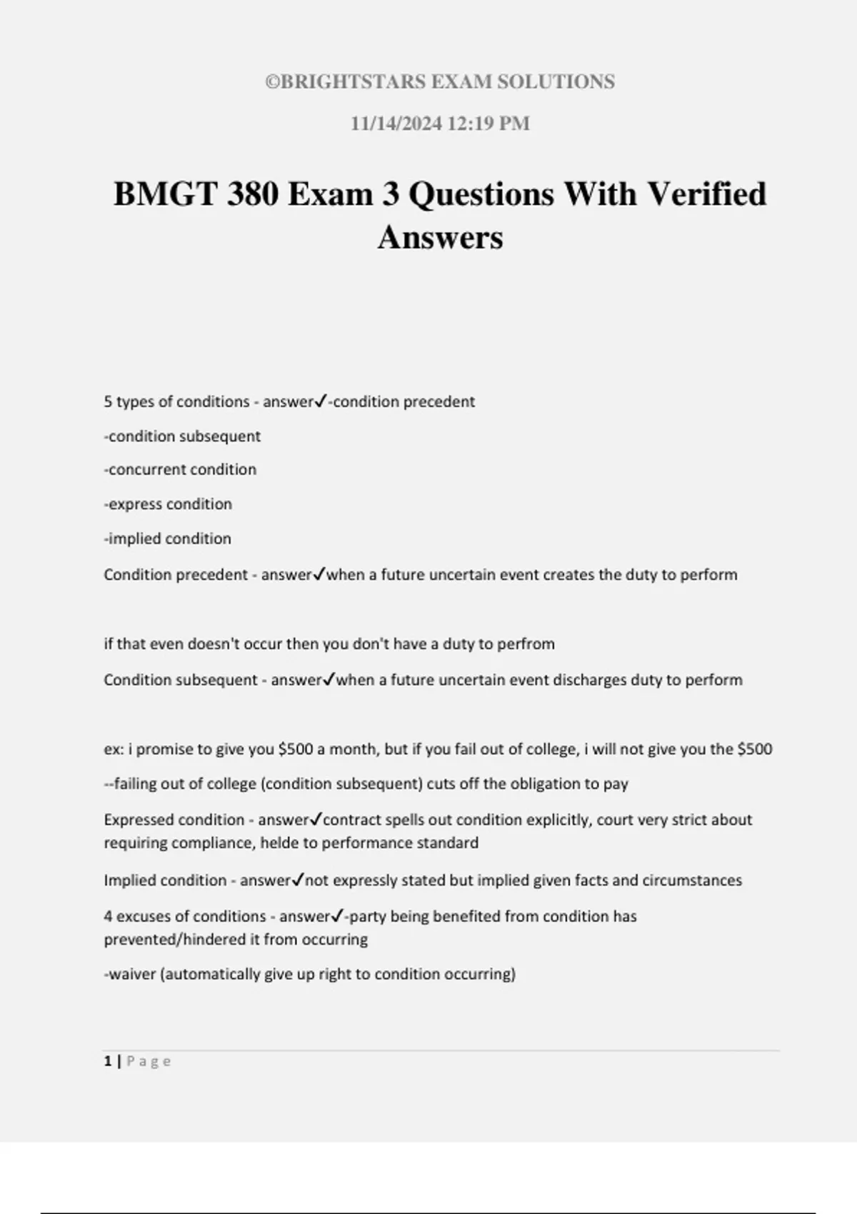 Condition precedent - answer✔when a future uncertain event creates the duty to perform
