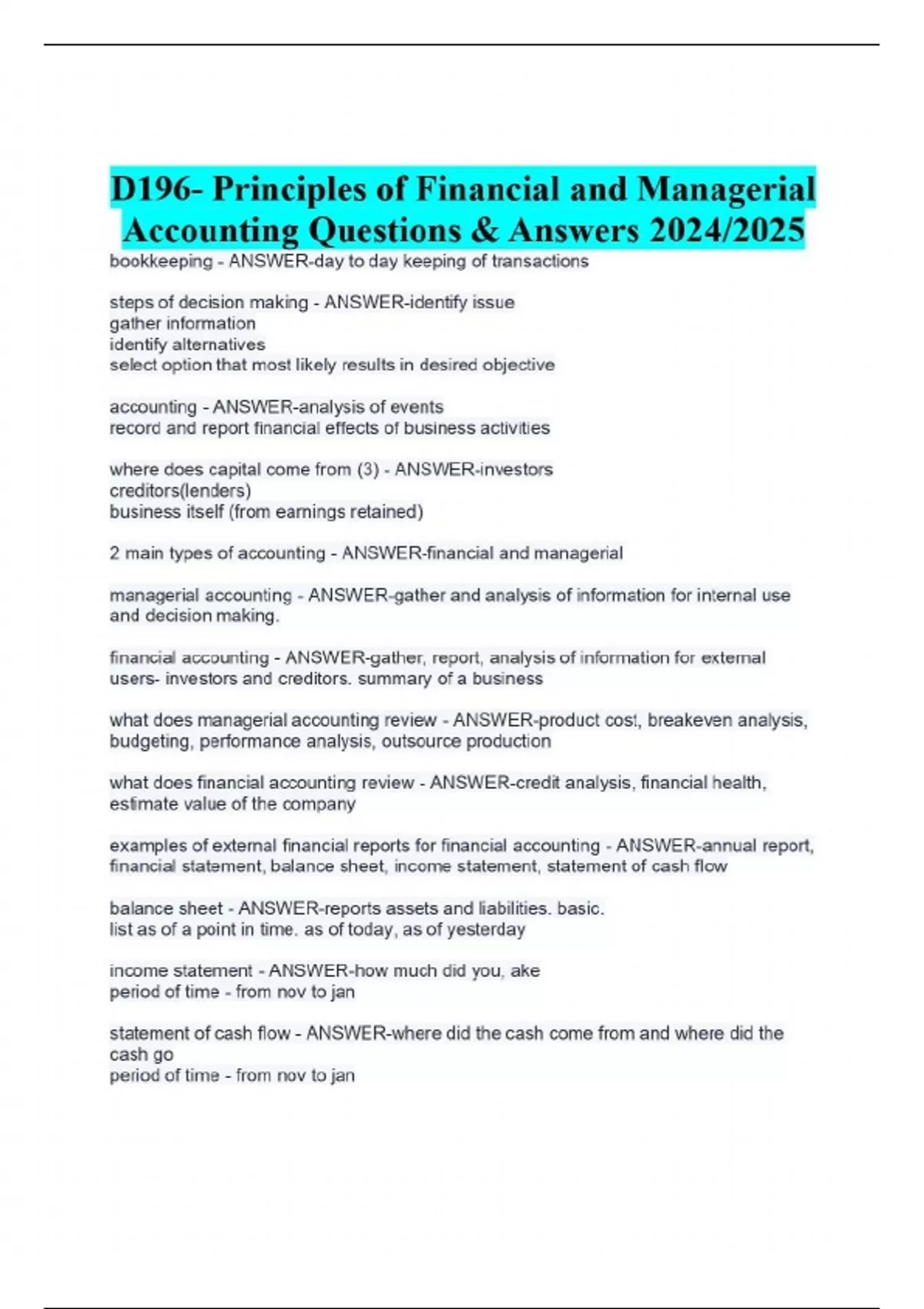 D196- Principles of Financial and Managerial Accounting Questions & Answers 2024/2025