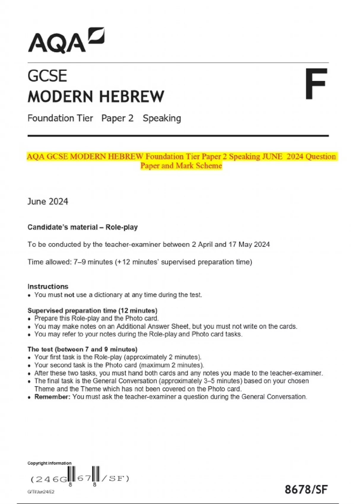 AQA GCSE MODERN HEBREW Foundation Tier Paper 2 Speaking JUNE 2024 Question Paper and Mark Scheme