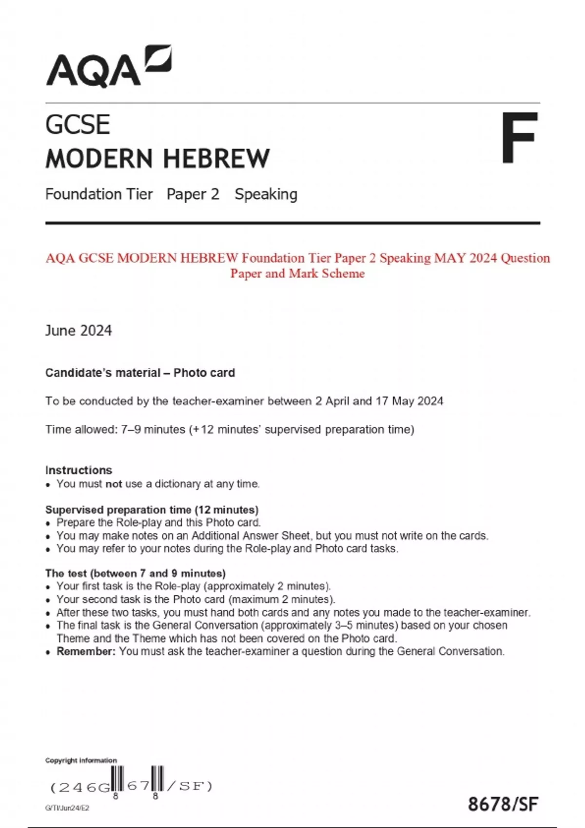 AQA GCSE MODERN HEBREW Foundation Tier Paper 2 Speaking MAY 2024 Question Paper and Mark Scheme