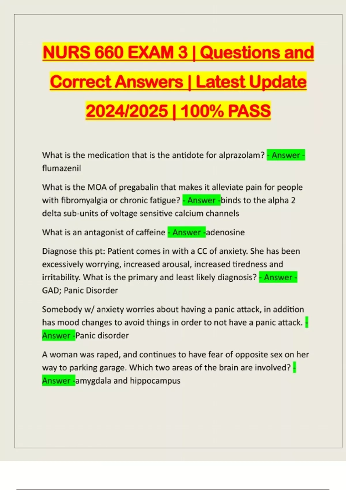 NURS 660 EXAM 3 | Questions and Correct Answers | Latest Update 2024/2025 | 100% PASS What is the medication that is the antidote for alprazolam? - Answer - flumazenil What is the MOA of pregabalin that makes it alleviate pain for people with fibromyalgia or chronic fatigue? - Answer -binds to the alpha 2 delta sub-units of voltage sensitive calcium channels What is an antagonist of caffeine - Answer -adenosine Diagnose this pt: Patient comes in with a CC of anxiety. She has been excessively worrying, increased arousal, increased tiredness and irritability. What is the primary and least likely diagnosis? - Answer - GAD; Panic Disorder Somebody w/ anxiety worries about having a panic attack, in addition has mood changes to avoid things in order to not have a panic attack. - Answer -Panic disorder A woman was raped, and continues to have fear of opposite sex on her way to parking garage. Which two areas of the brain are involved? - Answer -amygdala and hippocampusMOA of modafinil (Provigil). How does it promote normal wakefulness - Answer -histamine, NE at alpha adrenergic receptor sites, dopamine at D2 receptors What is the MOA of eszopiclone? What receptors does it act on? - Answer -Binds to GABA receptors to increase GABA to increase sleepiness Which would be the first line appropriate pharmacological agent for PTSD? - Answer -Paroxetine What mediation is used to alleviate to help cogni