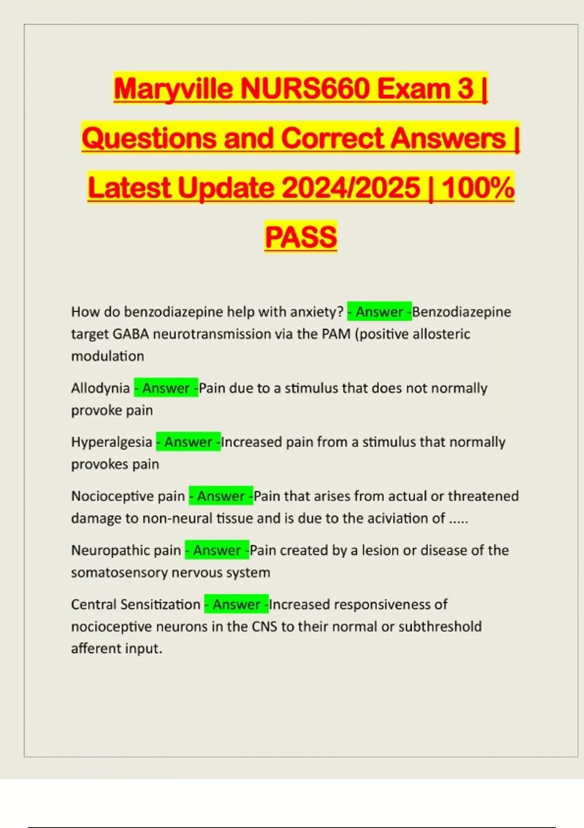 Maryville NURS660 Exam 3 | Questions and Correct Answers | Latest Update 2024/2025 | 100% PASS How do benzodiazepine help with anxiety? - Answer -Benzodiazepine target GABA neurotransmission via the PAM (positive allosteric modulation Allodynia - Answer -Pain due to a stimulus that does not normally provoke pain Hyperalgesia - Answer -Increased pain from a stimulus that normally provokes pain Nocioceptive pain - Answer -Pain that arises from actual or threatened damage to non-neural tissue and is due to the aciviation of ..... Neuropathic pain - Answer -Pain created by a lesion or disease of the somatosensory nervous system Central Sensitization - Answer -Increased responsiveness of nocioceptive neurons in the CNS to their normal or subthreshold afferent input.Nocioceptor - Answer -A primary afferent (sensory) neuron that is only activated by a noxious stimulus Nocioception - Answer -The process by which a nocioceptor detects a noxious stimulus and generates a signal (action potentials) that is propagated towards higher centers in the nocioceptive pathway Dorsal Root Ganglion (DRG) - Answer -Contains the ce
