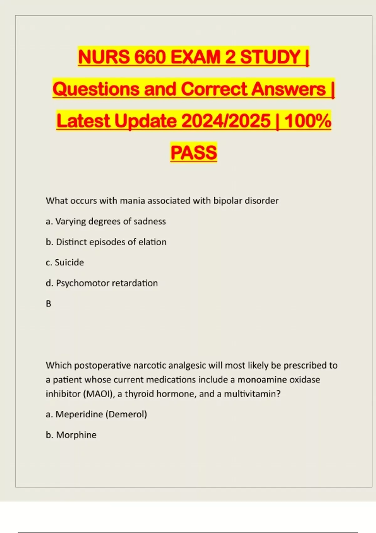 NURS 660 EXAM 2 STUDY | Questions and Correct Answers | Latest Update 2024/2025 | 100% PASS What occurs with mania associated with bipolar disorder a. Varying degrees of sadness b. Distinct episodes of elation c. Suicide d. Psychomotor retardation B Which postoperative narcotic analgesic will most likely be prescribed to a patient whose current medications include a monoamine oxidase inhibitor (MAOI), a thyroid hormone, and a multivitamin? a. Meperidine (Demerol) b. Morphinec. Ibuprofen (Advil) d. Acetaminophen (Tylenol) B What is the major advantage of selective serotonin reupt