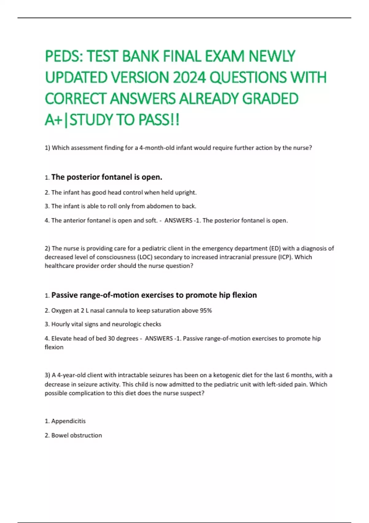 PEDS: TEST BANK FINAL EXAM NEWLY UPDATED VERSION 2024 QUESTIONS WITH CORRECT ANSWERS ALREADY GRADED A+|STUDY TO PASS!!