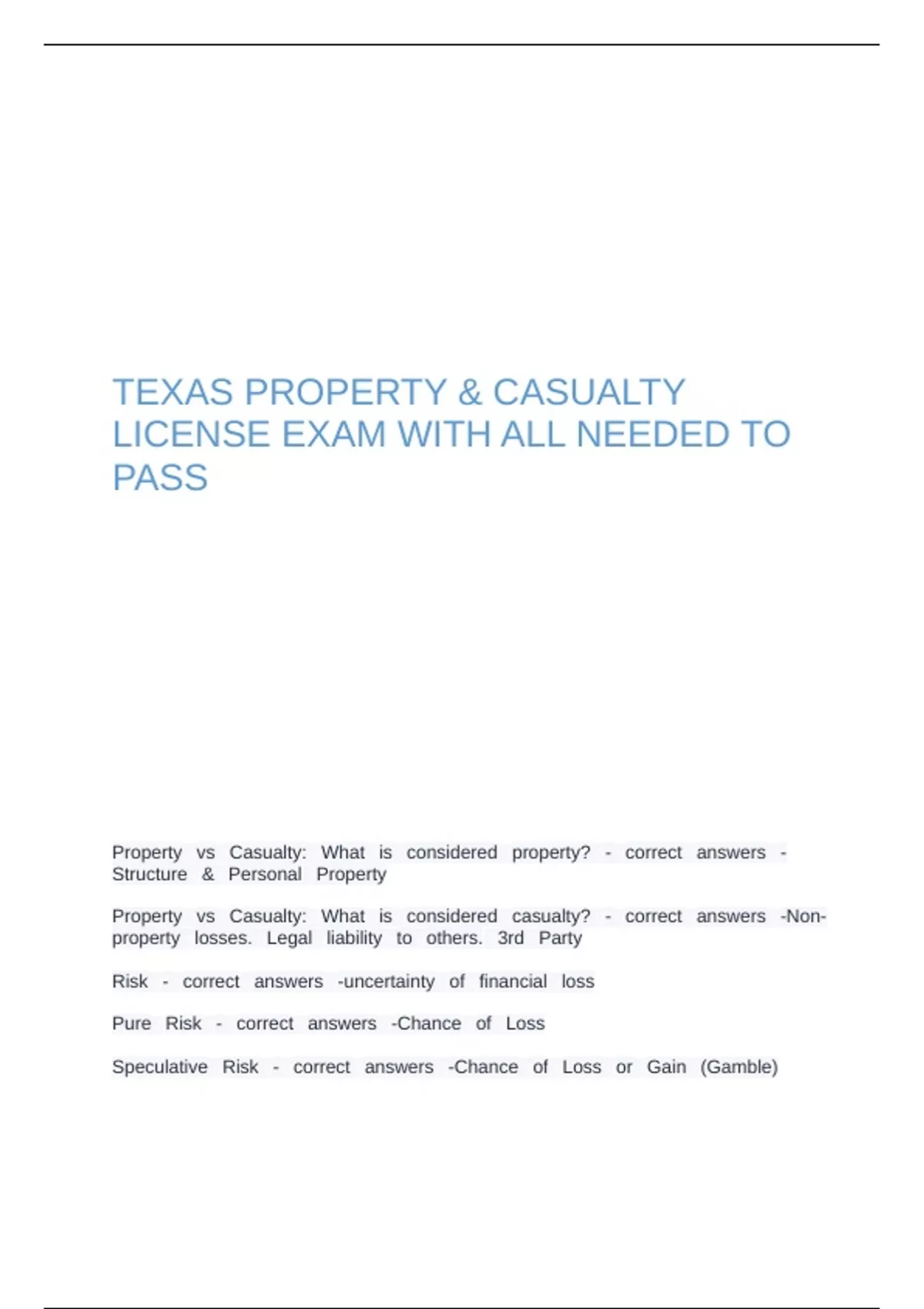 , Insurance g(covers gwhich gtype gof grisk?) g- gcorrect ganswers g-Pure gRisk gOnly