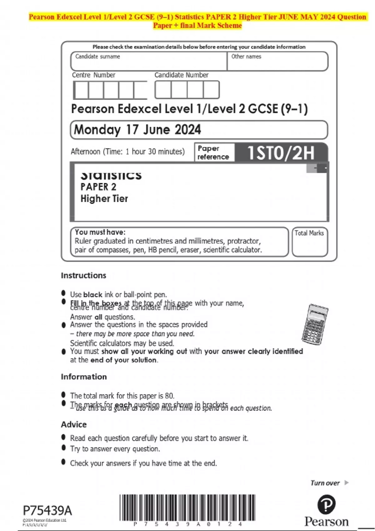 Pearson Edexcel Level 1/Level 2 GCSE (9–1) Statistics PAPER 2 Higher Tier JUNE MAY 2024 Question Paper + final Mark Scheme