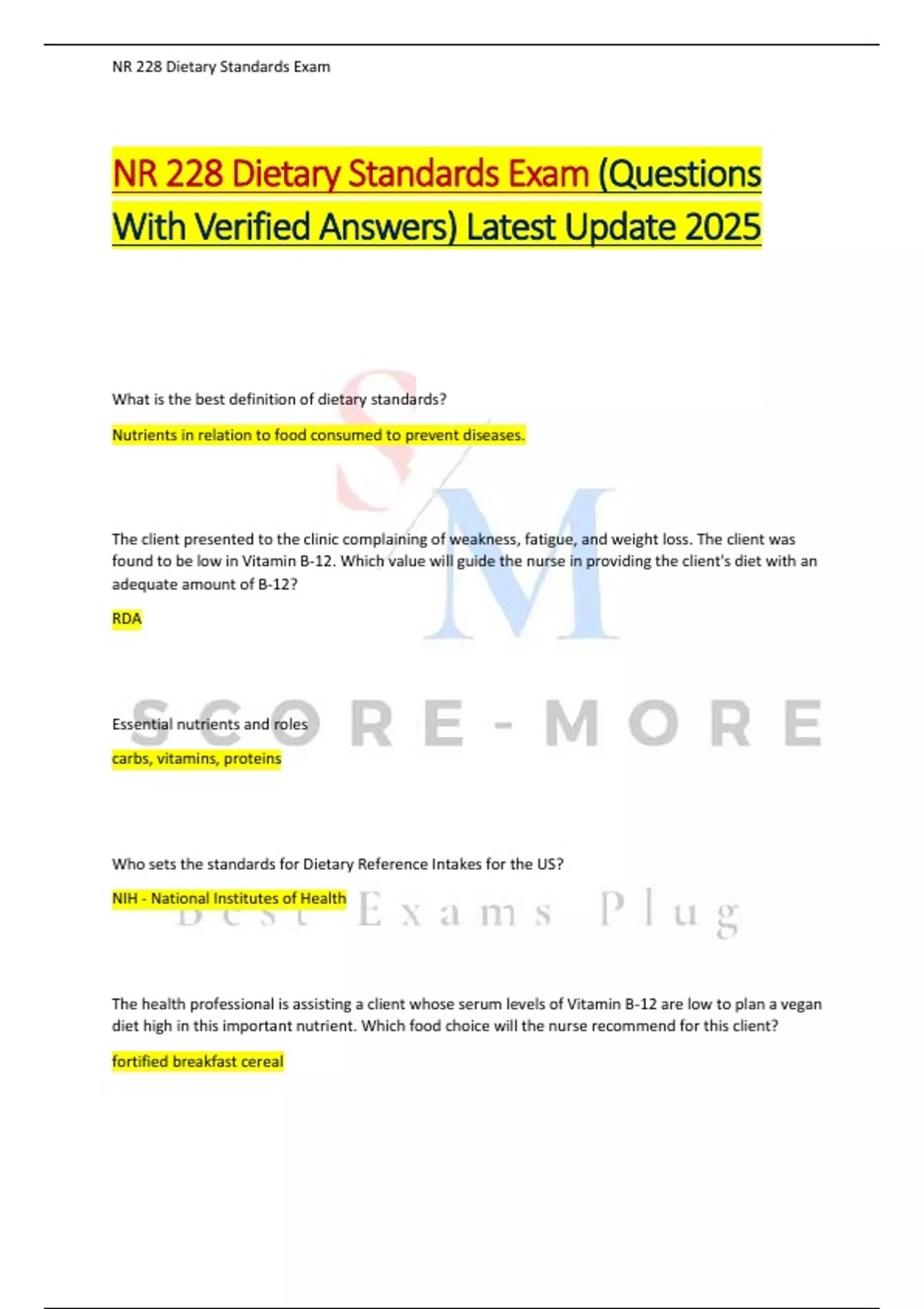NR 228 Dietary Standards Exam (Questions With Verified Answers) Latest Update 2025