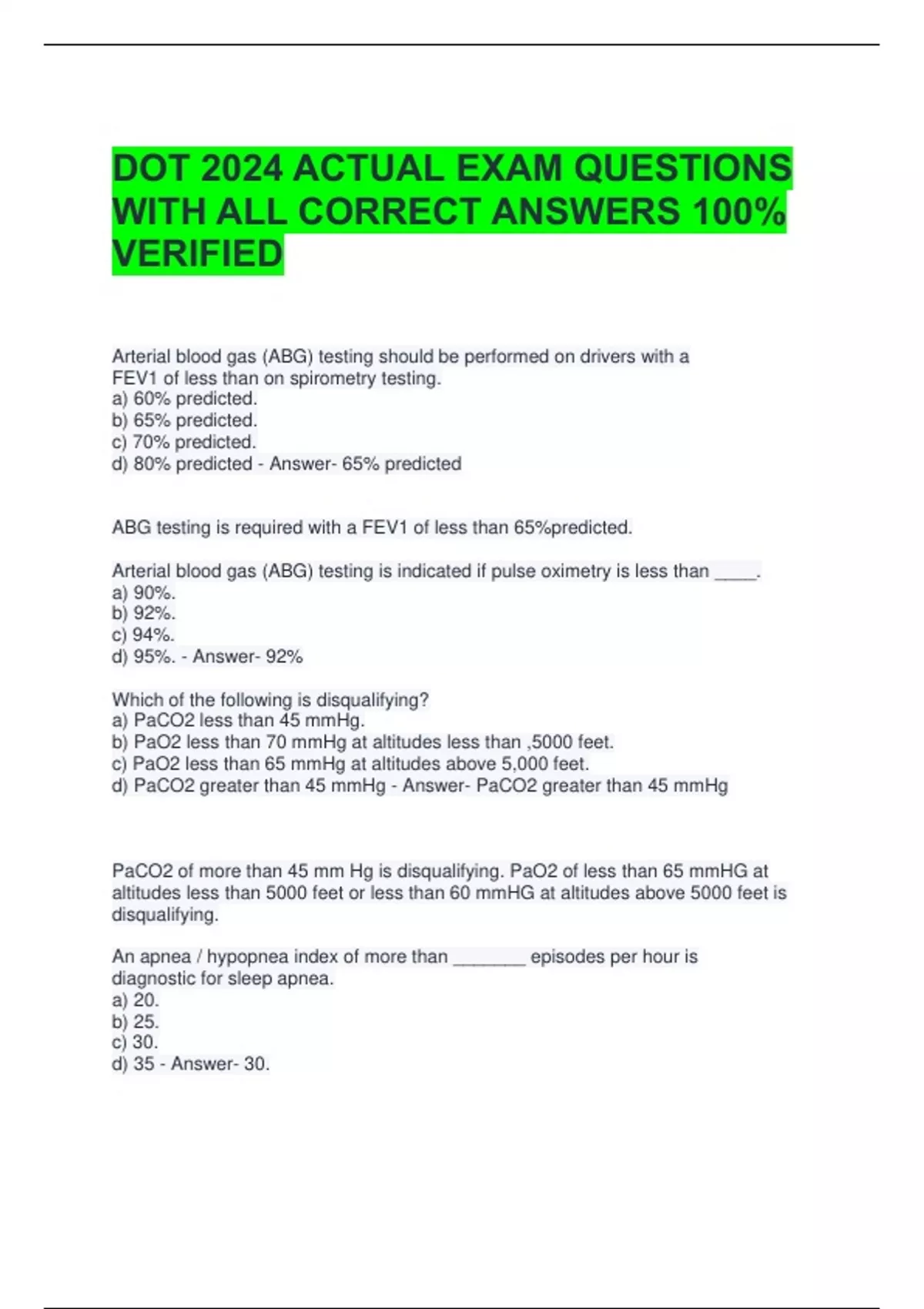 DOT 2024 ACTUAL EXAM QUESTIONS WITH ALL CORRECT ANSWERS 100% VERIFIED Arterial blood gas (ABG) testing should be performed on drivers with a FEV1 of less than on spirometry testing. a) 60% predicted. b) 65% predicted. c) 70% predicted. d) 80% predicted - Answer- 65% predicted ABG testing is required with a FEV1 of less than 65%predicted. Arterial blood gas (ABG) testing is indicated if pulse oximetry is less than ____. a) 90%. b) 92%. c) 94%. d) 95%. - Answer- 92% Which of the following is disqualifying? a) PaCO2 less than 45 mmHg. b) PaO2 less than 70 mmHg at altitudes less than ,5000 feet. c) PaO2 less than 65 mmHg at altitudes above 5,000 feet. d) PaCO2 greater than 45 mmHg - Answer- PaCO2 greater than 45 mmHg PaCO2 of more than 45 mm Hg is disqualifying. PaO2 of less than 65 mmHG at altitudes less than 5000 feet or less than 60 mmHG at altitudes above 5000 feet is disqualifying. An apnea / hypopnea index of more than _______ episodes per hour is diagnostic for sleep apnea. a) 20. b) 25. c) 30. d) 35 - Answer- 30. A apnea / hypopnea index of more than 30 episodes per hour is diagnostic for sleep apnea. Guidelines for obstructive sleep apnea: a) Are regulatory. b) Require a waiting period of 2 months after initiation of CPAP treatment. c) Include a 2-month waiting period after surgical treatment. d) Require disqualification if the driver has restless leg syndrome (RLS) associated with excessive daytime sleepiness (EDS). - Answer- Require disqualification if the driver has restless leg syndrome (RLS) associated with excessive daytime sleepiness (EDS). The waiting period after CPAP treatment is 1 month and after surgical treatment is 3 months. Indications for pulse oximetry and /or arterial blood gas (ABG) include: a) FEV1 less than 70% predicted. b) FEV1/FVC ratio less than 70%predicted. c) Restrictive impairment present and FVC less than 70%predicted. d) If oximetry is less than 92%, the driver must have ABG analysis. - Answer- If oximetry is less than 92%, the driver must have ABG analysis.