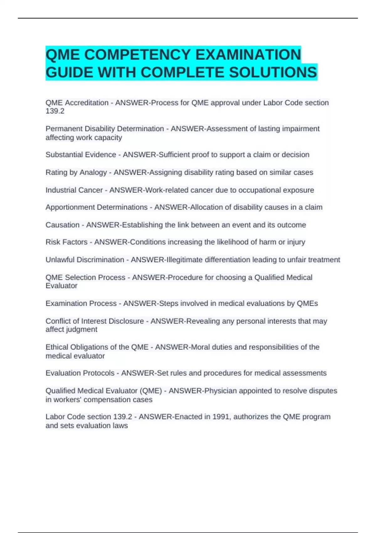 QME COMPETENCY EXAMINATION GUIDE WITH COMPLETE SOLUTIONSQME COMPETENCY EXAMINATION GUIDE WITH COMPLETE SOLUTIONSQME COMPETENCY EXAMINATION GUIDE WITH COMPLETE SOLUTIONS QME Accreditation - ANSWER-Process for QME approval under Labor Code section 139.2 Permanent Disability Determination - ANSWER-Assessment of lasting impairment affecting work capacity Substantial Evidence - ANSWER-Sufficient proof to support a claim or decision Rating by Analogy - ANSWER-Assigning disability rating based on similar cases Industrial Cancer - ANSWER-Work-related cancer due to occupational exposure Apportionment Determinations - ANSWER-Allocation of disability causes in a claim Causation - ANSWER-Establishing the link between an event and its outcome Risk Factors - ANSWER-Conditions increasing the likelihood of harm or injury