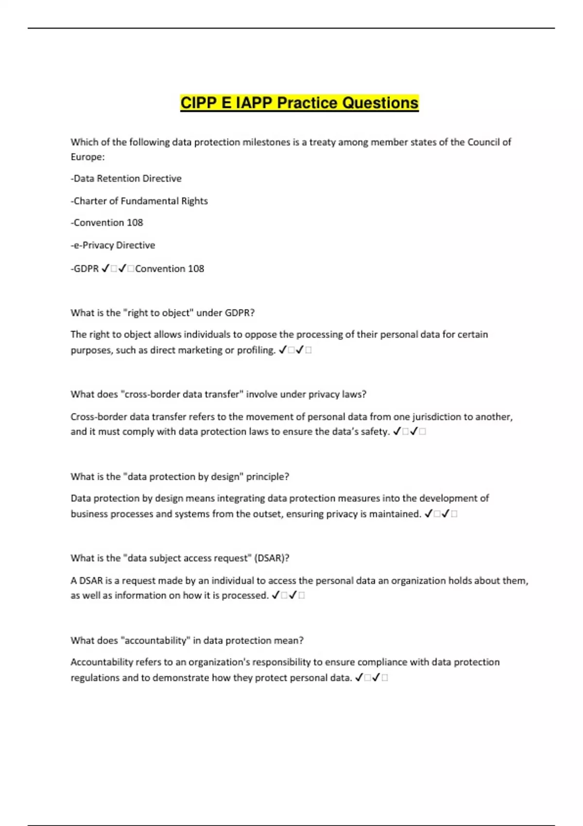 CIPP E IAPP Practice Questions Which of the following data protection milestones is a treaty among member states of the Council of Europe: -Data Retention Directive -Charter of Fundamental Rights -Convention 108 -e-Privacy Directive -GDPR ️️Convention 108 What is the "right to object" under GDPR? The right to object allows individuals to oppose the processing of their personal data for certain purposes, such as direct marketing or profiling. ️️ What does "cross-border data transfer" involve under privacy laws? Cross-border data transfer refers to the movement of personal data from one jurisdiction to another, and it must comply with data protection laws to ensure the data’s safety. ️️ What is the "data protection by design" principle? Data protection by design means integrating data protection measures into the development of business processes and systems from the outset, ensuring privacy is maintained. ️️ What is the "data subject access request" (DSAR)? A DSAR is a request made by an individual to access the personal data an organization holds about them, as well as information on how it is processed. ️️ What does "accountability" in data protection mean? Accountability refers to an organization's responsibility to ensure compliance with data protection regulations and to demonstrate how they protect personal data. ️️ What is a "Privacy Impact Assessment" (PIA)? A Privacy Impact Assessment is an evaluation of the privacy risks of a project or system and the steps needed to mitigate those risks before data processing begins. ️️ What is the difference between "anonymization" and "pseudonymization"? Anonymization irreversibly removes identifiable information from data, while pseudonymization replaces identifying details with pseudonyms but allows for re-identification if necessary. ️️ What does "data minimization" mean? Data minimization means collecting and processing only the personal data necessary for a specific purpose, avoiding excessive or unnecessary data collection. ️️ What is a "third-party processor" in data protection? A third-party processor is an external entity contracted by a data controller to process personal data on their behalf, and must comply with data protection agreements and laws. ️️ What is "purpose limitation" under GDPR? Purpose limitation means that personal data should only be collected for specific, legitimate purposes and should not be further processed in a way that is incompatible with those purposes. ️️ What does "data breach" mean in privacy regulations? A data breach is an event where personal data is accessed, disclosed, lost, or altered without authorization, potentially impacting data security and privacy. ️️ What are "special categories of personal data" under GDPR? Special categories of personal data include sensitive data like racial or ethnic origin, political opinions, religious beliefs, and health data, which require heightened protection. ️️ What does "data encryption" help protect? Data encryption helps protect personal data by transforming it into a format that is unreadable without the decryption key, ensuring privacy and security during storage or transfer. ️️ What does "data retention" mean? Data retention refers to how long personal data is stored, with the requirement that it should only be kept for as long as necessary for the purposes it was collected. ️️ What is the "right to rectification" under GDPR? The right to rectification allows individuals to request corrections to inaccurate or incomplete personal data that an organization holds about them. ️️ What does "cloud computing" mean in relation to data privacy? Cloud computing involves storing and processing data on remote servers, and requires organizations to ensure that appropriate privacy and security measures are in place for data stored in the cloud. ️️ What is "data governance"? Data governance refers to the set of processes, policies, and standards that ensure data is managed, protected, and used in compliance with privacy laws and organizational goals. ️️ What is the "right to erasure" under GDPR? The right to erasure, also known as the "right to be forgotten," allows individuals to request that their personal data be deleted when it is no longer necessary or when they withdraw consent. ️️ What is the role of a Data Protection Officer (DPO)? A DPO oversees an organization’s data protection strategy, ensures compliance with privacy laws, and serves as a point of contact for data subjects and regulators. ️️ What are "cookies" in the context of data protection? Cookies are small data files stored on a user’s device by websites, and they must be disclosed through a cookie policy, with user consent to track or collect data. ️️ What is "data access control"? Data access control involves restricting access to personal data based on the user’s role and need to know, ensuring that unauthorized individuals do not access sensitive data. ️️ What is the purpose of a "Data Processing Agreement" (DPA)? A DPA is a legal contract between a data controller and data processor that outlines how personal data will be handled, processed, and protected. ️️ What is the "right to data portability" under GDPR? The right to data portability allows individuals to obtain their personal data in a structured, machine readable format and transfer it to another service provider. ️️
