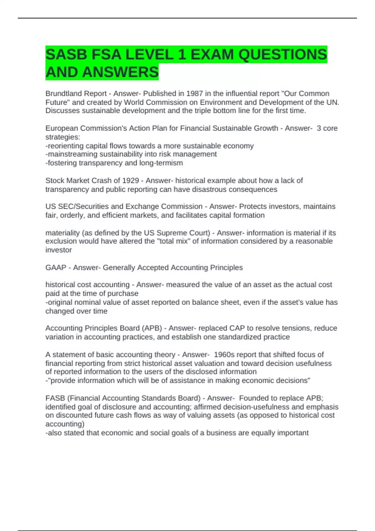 SASB FSA LEVEL 1 EXAM QUESTIONS AND ANSWERS