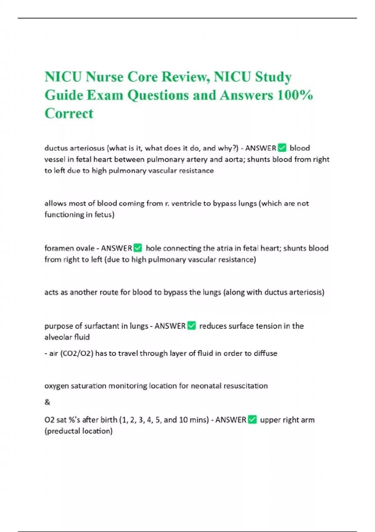 NICU Nurse Core Review, NICU Study Guide Exam Questions and Answers 100% Correct