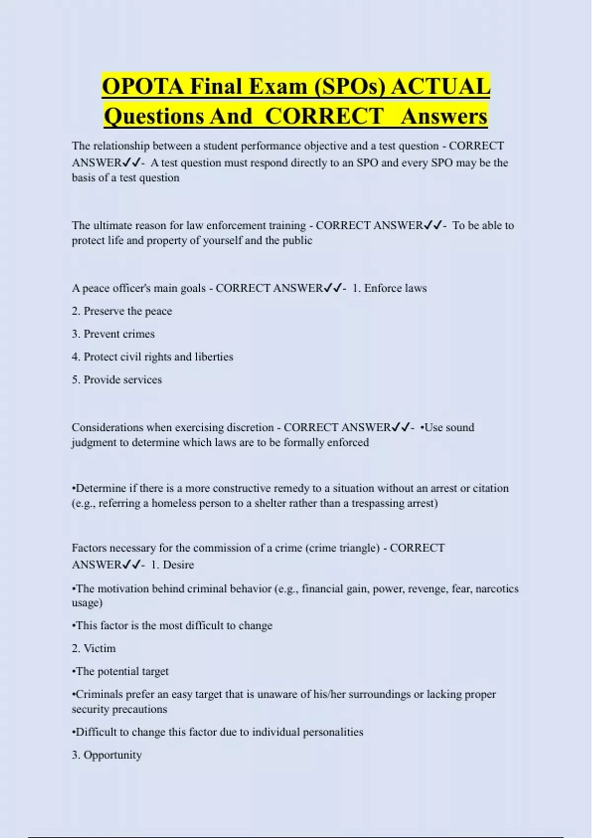 ANSWER✔✔- A test question must respond directly to an SPO and every SPO may be the