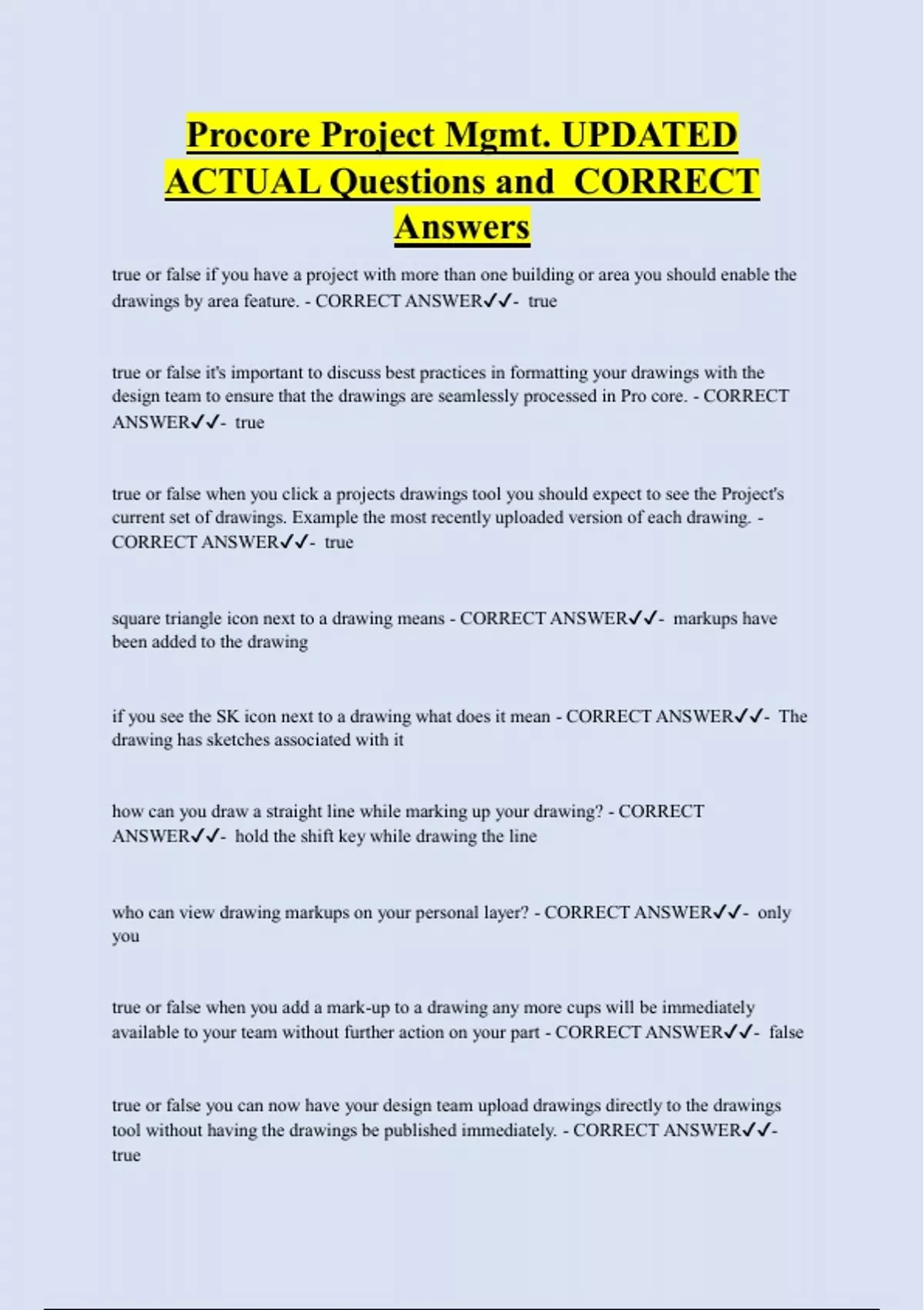 Procore Project Mgmt. UPDATED ACTUAL Questions and CORRECT Answers true or false if you have a project with more than one building or area you should enable the drawings by area feature. - CORRECT ANSWER- true true or false it's important to discuss best practices in formatting your drawings with the design team to ensure that the drawings are seamlessly processed in Pro core. - CORRECT ANSWER- true