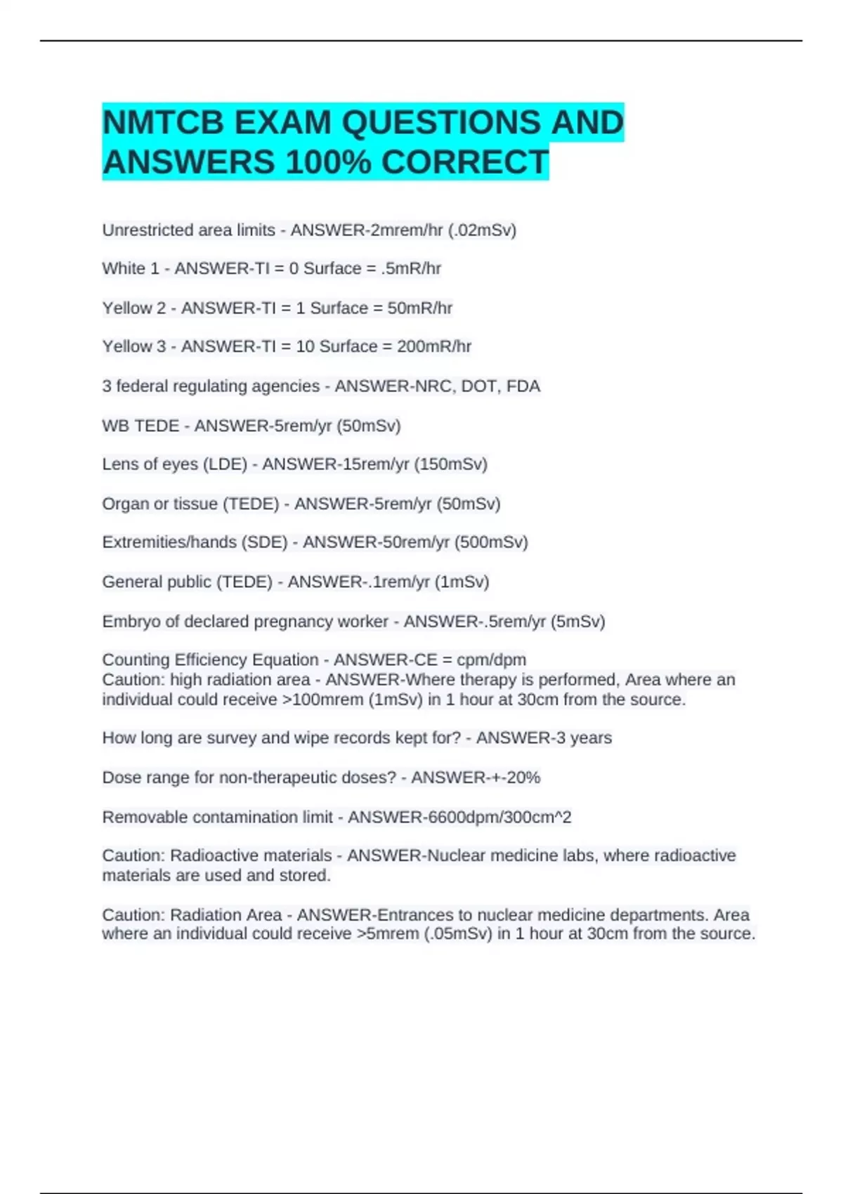 Unrestricted area limits - ANSWER-2mrem/hr (.02mSv)