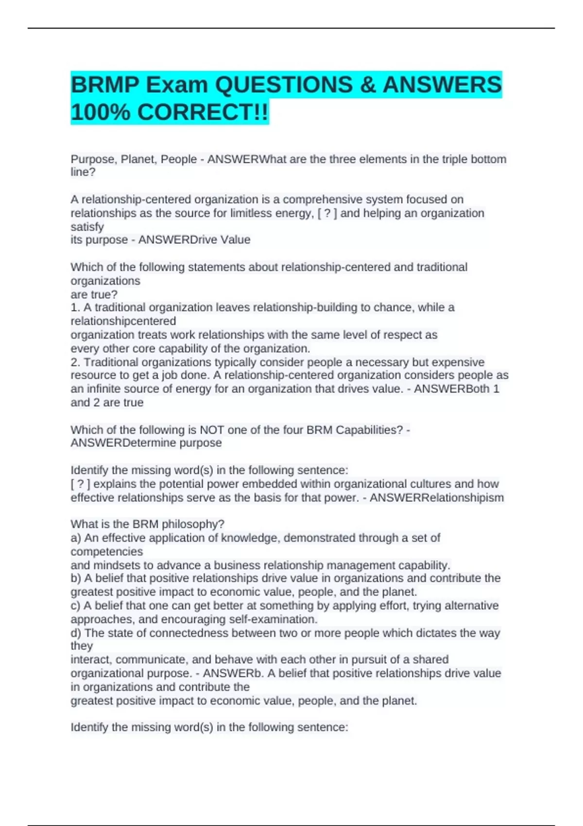 Purpose, Planet, People - ANSWERWhat are the three elements in the triple bottom line? A relationship-centered organization is a comprehensive system focused on relationships as the source for limitless energy, [ ? ] and helping an organization satisfy its purpose - ANSWERDrive Value Which of the following statements about relationship-centered and traditional organizations are true? 1. A traditional organization leaves relationship-building to chance, while a relationshipcentered organization treats work relationships with the same level of respect as every other core capability of the organization. 2. Traditional organizations typically consider people a necessary but expensive resource to get a job done. A relationship-centered organization considers people as an infinite source of energy for an organization that drives value. - ANSWERBoth 1 and 2 are true Which of the following is NOT one of the four BRM Capabilities? - ANSWERDetermine purpose Identify the missing word(s) in the following sentence: [ ? ] explains the potential power embedded within organizational cultures and how effective relationships serve as the basis for that power. - ANSWERRelationshipism What is the BRM philosophy? a) An effective application of knowledge, demonstrated through a set of competencies and mindsets to advance a business relationship management capability. b) A belief that positive relationships drive value in organizations and contribute the greatest positive impact to economic value, people, and the planet. c) A belief that one can get better at something by applying effort, trying alternative approaches, and encouraging self-examination. d) The state of connectedness between two or more people which dictates the way they interact, communicate, and behave with each other in pursuit of a shared organizational purpose. - ANSWERb. A belief that positive relationships drive value in organizations and contribute the greatest positive impact to economic value, people, and the planet. Identify the missing word(s) in the following sentence: A BRM discipline is the effective application of knowledge, demonstrated through a set of competencies and mindsets to advance a business relationship management [ ? ]. a) Capability b) Philosophy c) Role d) Relationship - ANSWERa) Capability Which of the following statements about organizational purpose are true? 1. Purpose provides the organization's "why," their reason for existence. 2. Purpose provides a reason for the organization to be in a specific industry. a) Only 1 is true b) Only 2 is true c) Both 1 and 2 are true d) Neither 1 or 2 is true - ANSWERa) Only 1 is true