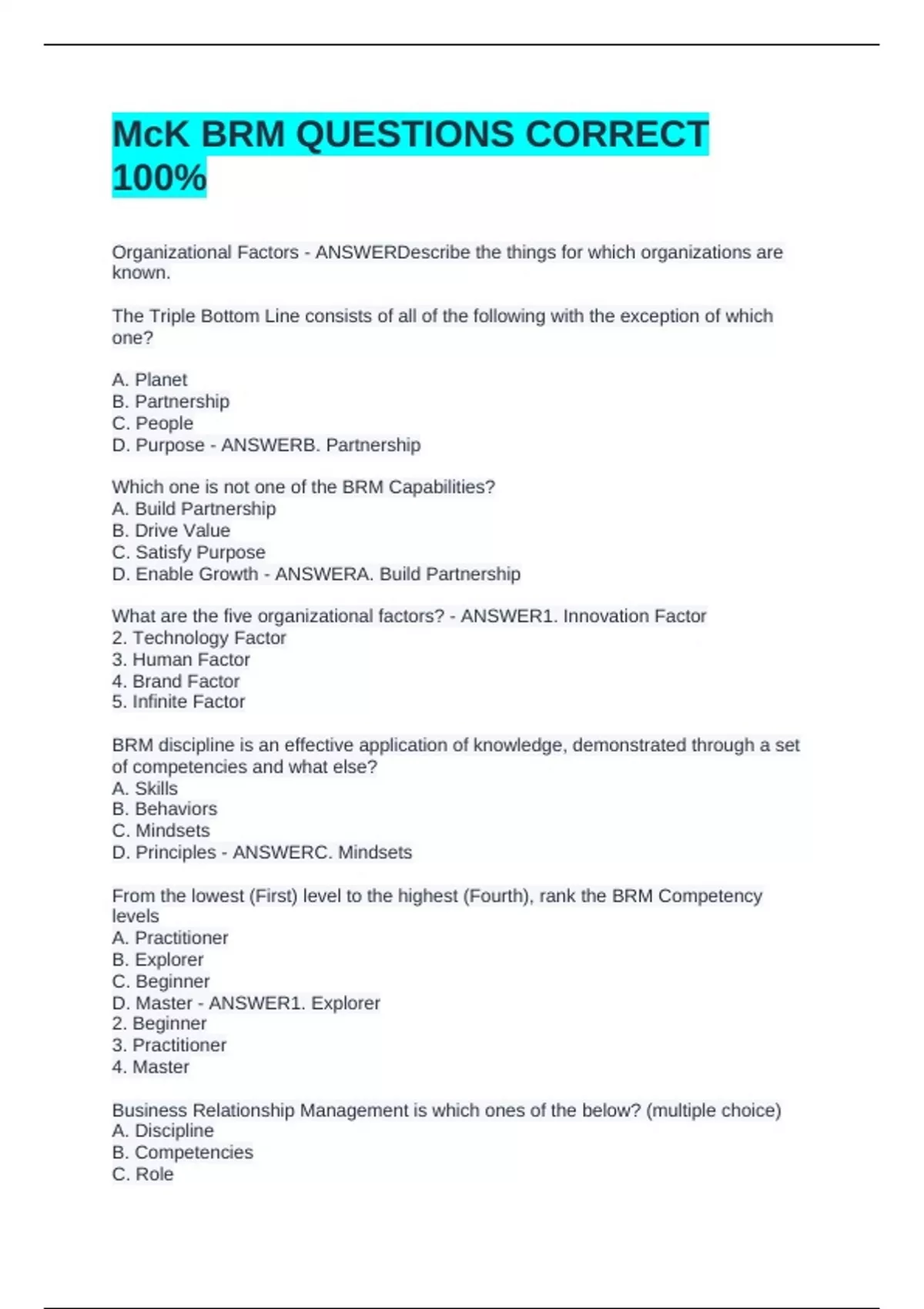 Organizational Factors - ANSWERDescribe the things for which organizations are known. The Triple Bottom Line consists of all of the following with the exception of which one? A. Planet B. Partnership C. People D. Purpose - ANSWERB. Partnership Which one is not one of the BRM Capabilities? A. Build Partnership B. Drive Value C. Satisfy Purpose D. Enable Growth - ANSWERA. Build Partnership What are the five organizational factors? - ANSWER1. Innovation Factor 2. Technology Factor 3. Human Factor 4. Brand Factor 5. Infinite Factor BRM discipline is an effective application of knowledge, demonstrated through a set of competencies and what else? A. Skills B. Behaviors C. Mindsets D. Principles - ANSWERC. Mindsets From the lowest (First) level to the highest (Fourth), rank the BRM Competency levels A. Practitioner B. Explorer C. Beginner D. Master - ANSWER1. Explorer 2. Beginner 3. Practitioner 4. Master