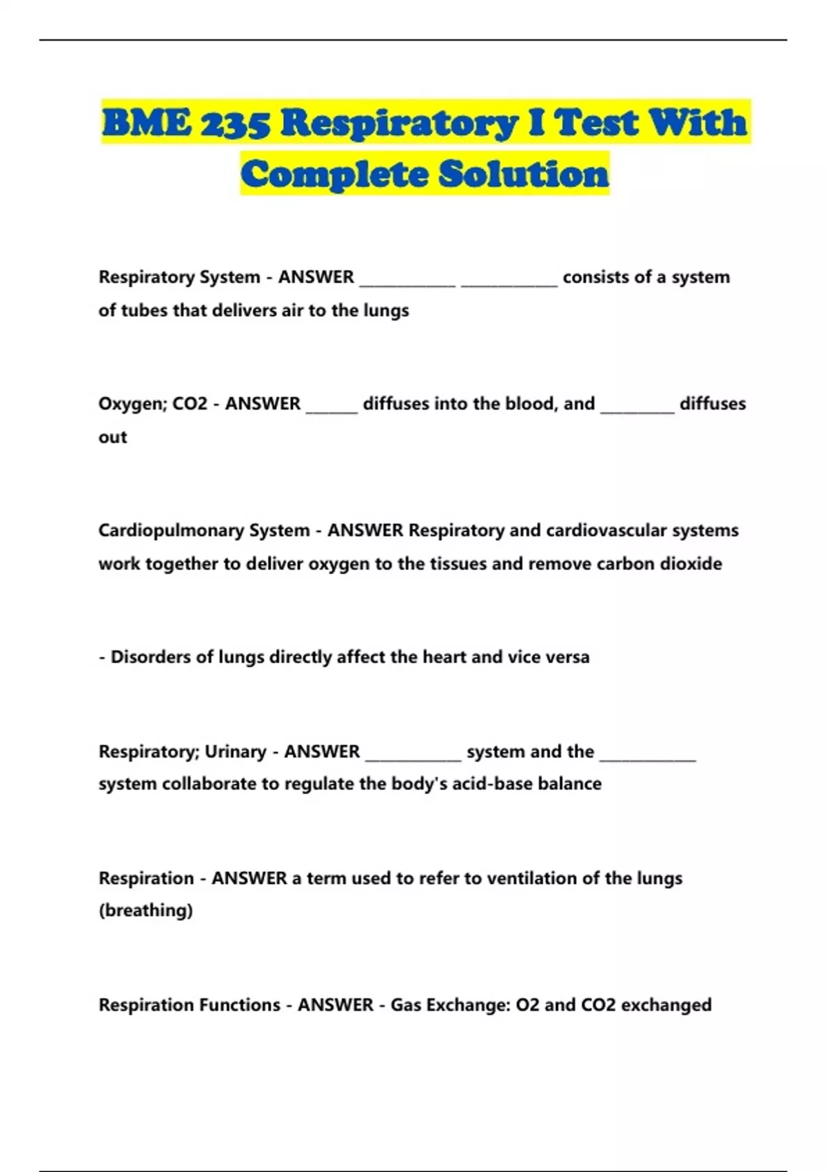 BME 235 Respiratory I Test With Complete Solution...