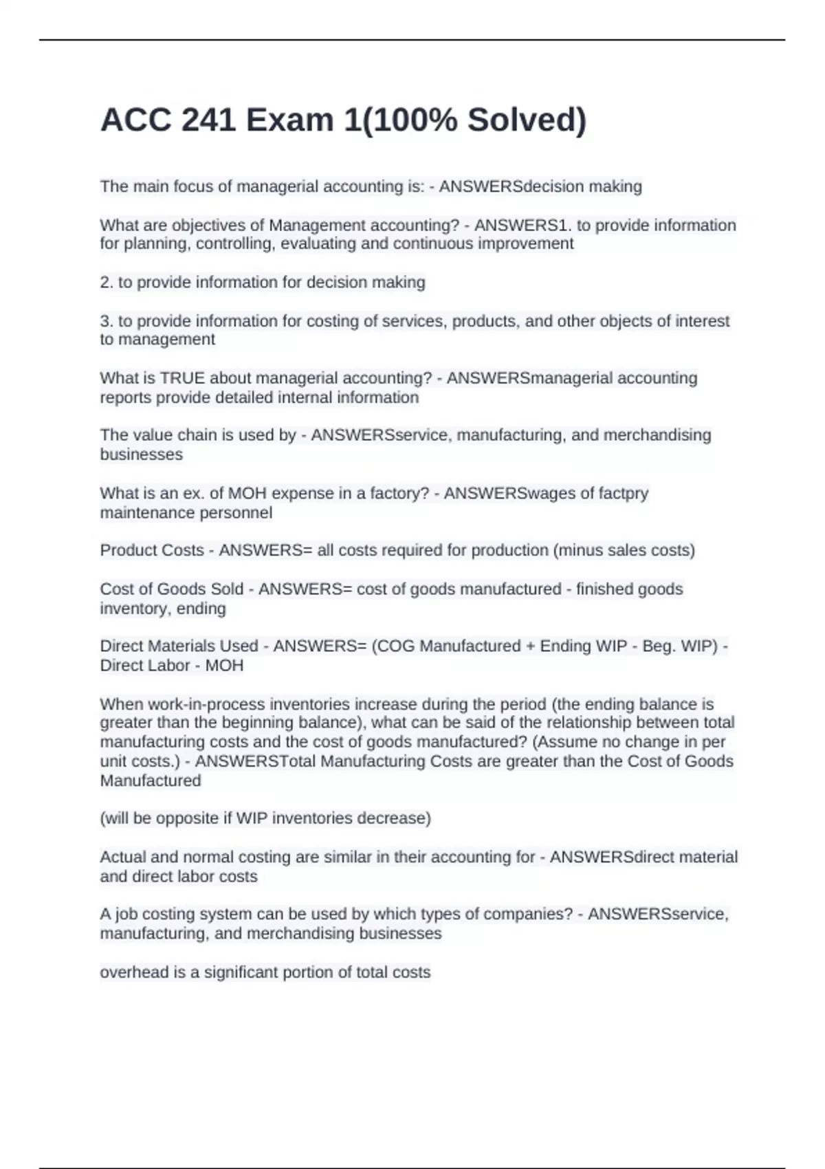The main focus of managerial accounting is: - ANSWERSdecision making What are objectives of Management accounting? - ANSWERS1. to provide information for planning, controlling, evaluating and continuous improvement 2. to provide information for decision making 3. to provide information for costing of services, products, and other objects of interest to management What is TRUE about managerial accounting? - ANSWERSmanagerial accounting reports provide detailed internal information The value chain is used by - ANSWERSservice, manufacturing, and merchandising businesses What is an ex. of MOH expense in a factory? - ANSWERSwages of factpry maintenance personnel Product Costs - ANSWERS= all costs required for production (minus sales costs) Cost of Goods Sold - ANSWERS= cost of goods manufactured - finished goods inventory, ending Direct Materials Used - ANSWERS= (COG Manufactured + Ending WIP - Beg. WIP) - Direct Labor - MOH When work-in-process inventories increase during the period (the ending balance is greater than the beginning balance), what can be said of the relationship between total manufacturing costs and the cost of goods manufactured? (Assume no change in per unit costs.) - ANSWERSTotal Manufacturing Costs are greater than the Cost of Goods Manufactured (w