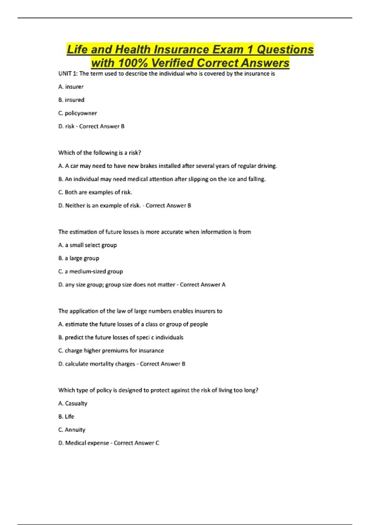 Life and Health Insurance Exam 1 Questions with 100% Verified Correct Answers UNIT 1: The term used to describe the individual who is covered by the insurance is A. insurer B. insured C. policyowner D. risk - Correct Answer B Which of the following is a risk? A. A car may need to have new brakes installed after several years of regular driving. B. An individual may need medical attention after slipping on the ice and falling. C. Both are examples of risk. D. Neither is an example of risk. - Correct Answer B The estimation of future losses is more accurate when information is from A. a small select group B. a large group C. a medium-sized group D. any size group; group size does not matter - Correct Answer A The application of the law of large numbers enables insurers to A. estimate the future losses of a class or group of people B. predict the future losses of speci c individuals C. charge higher premiums for insurance D. calculate mortality charges - Correct Answer B Which type of policy is designed to protect against the risk of living too long? A. Casualty B. Life C. Annuity D. Medical expense - Correct
