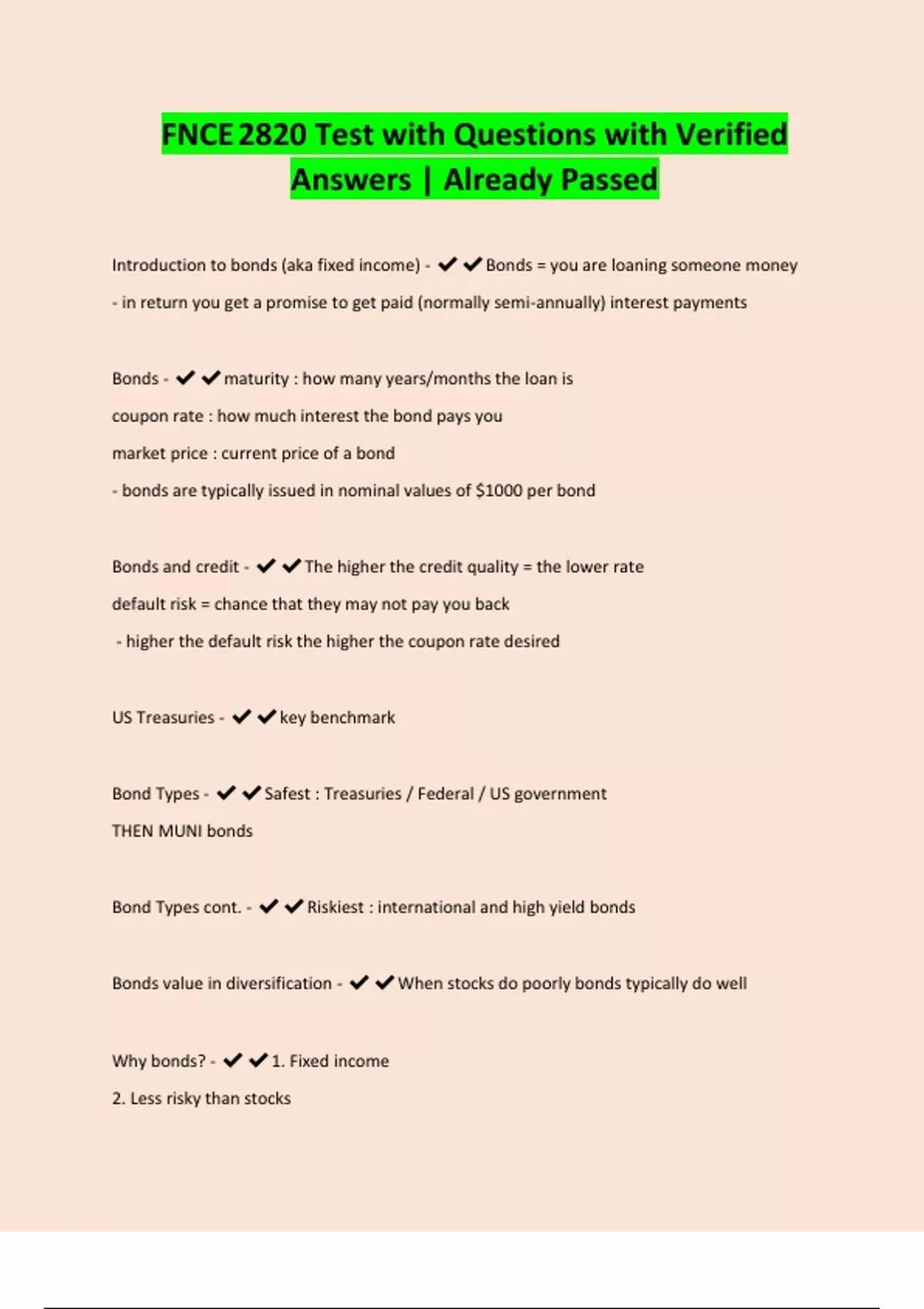 FNCE 2820 Test with Questions with Verified Answers | Already Passed